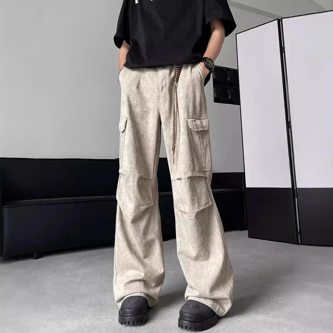 アメリカンレトロメンズファッションブランド ハイストリートビッグポケット ルーズフィットカジュアル ダークストライプワークウェアワイドレッグパンツ