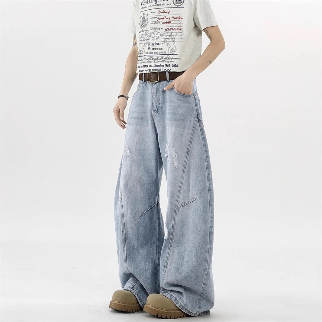 カーブドジーンズ(男性用) 夏向けトレンドブランド デザイン性のある穴あきパンツ ハイストリート風ウォッシュ加工 ロング丈