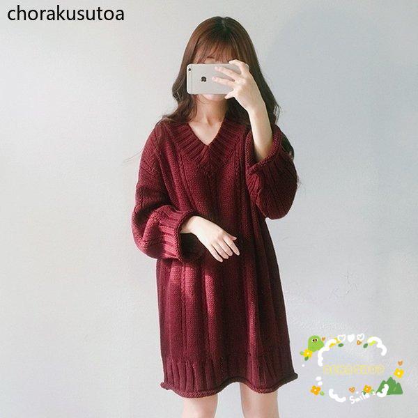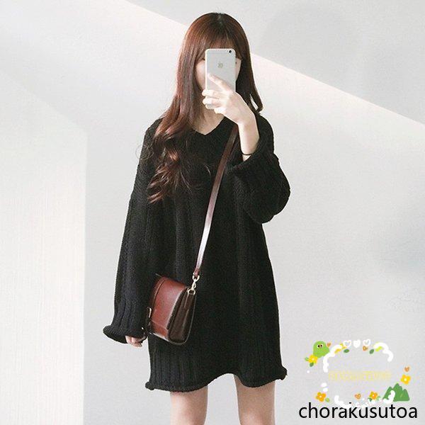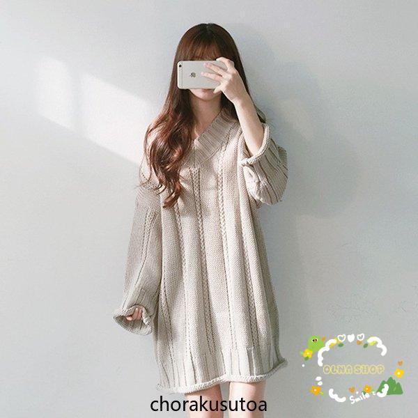 【20 代~40 代 体型カバー】レディース V ネックニットワンピース 膝丈ゆったりチュニック 着痩せおしゃれ秋冬トップス