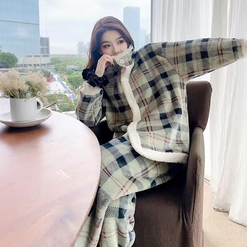 厚手複合フリースチェックパジャマ女性冬新作裏地付き保温カジュアルおしゃれホームウェアセット外出用
