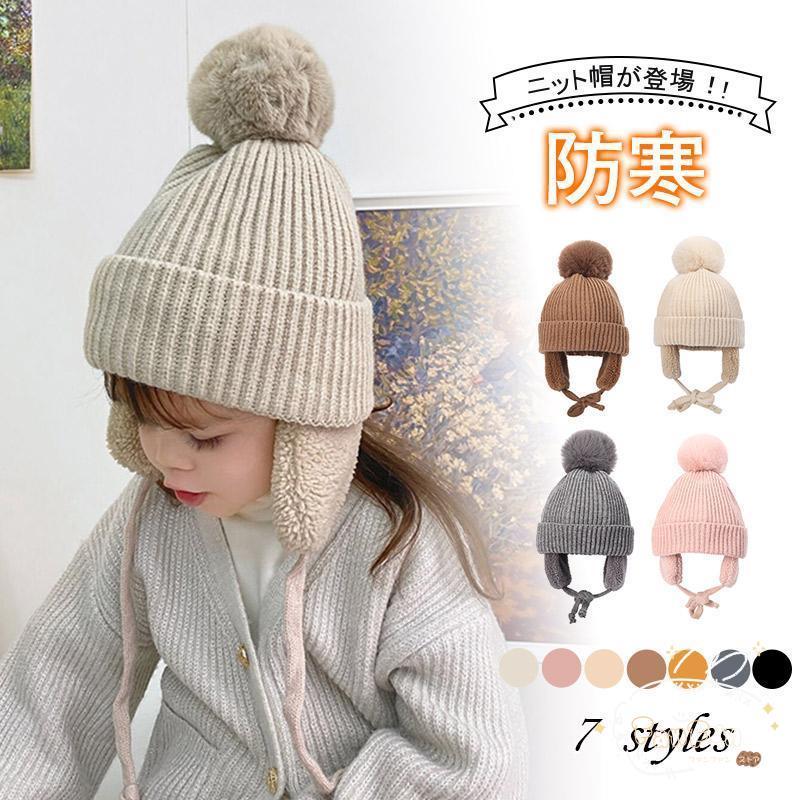 ニット帽 子供 ニットキャップ 女児男児 帽子 キッズ キャップ 裏ボア 男女兼用 耳あて付き 女の子 男の子 ポンポン ふわふわ 防寒保温