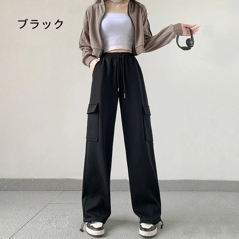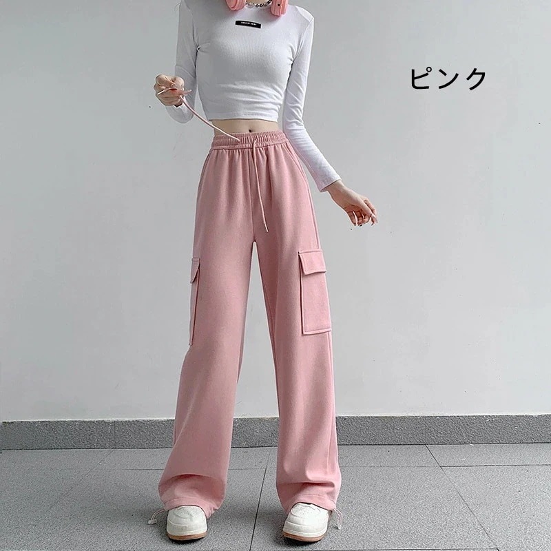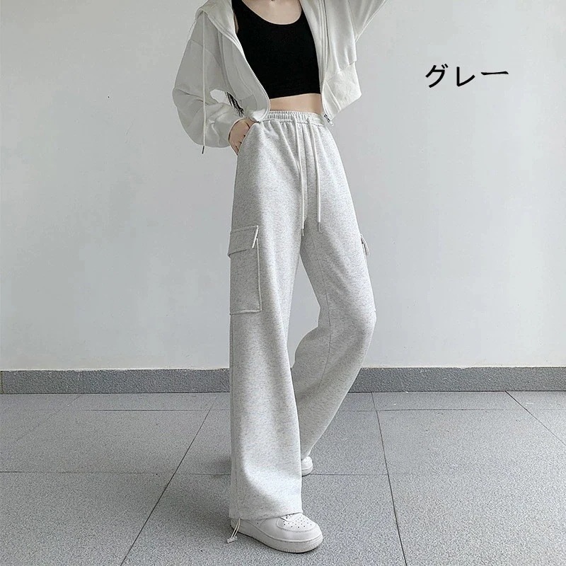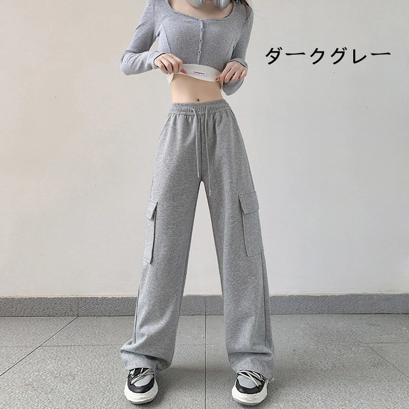 グレー カーゴパンツ レディース 無地 薄い ワイドパンツ ハイウェスト カジュアル スウェットパンツウエストゴム体型カバー 細見え