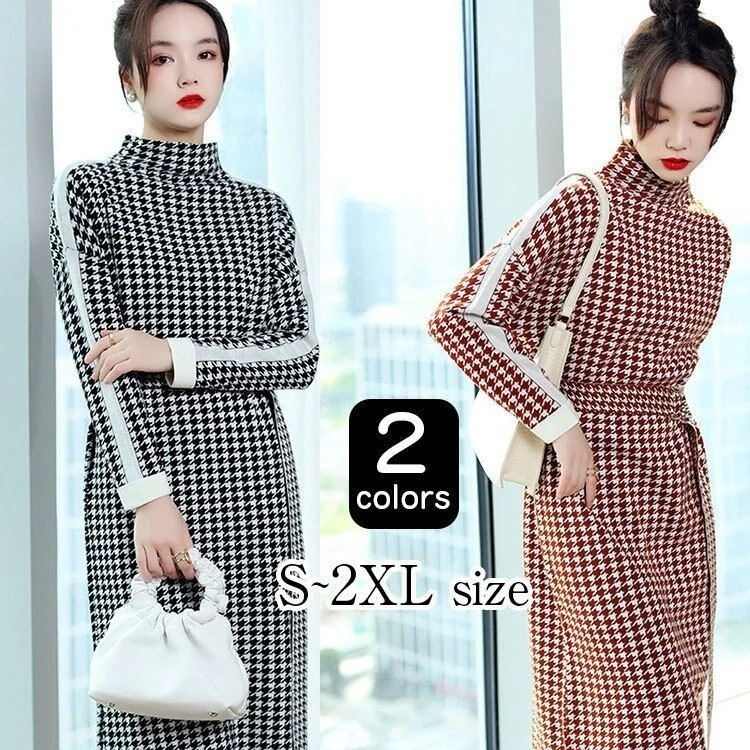 [安くなりました]ニットワンピース 40代 ニットワンピ 千鳥柄ワンピース レディース 春新作 長袖 ロングワンピース スカート ハイネック 着痩せ きれいめ 韓国風 30代 50代