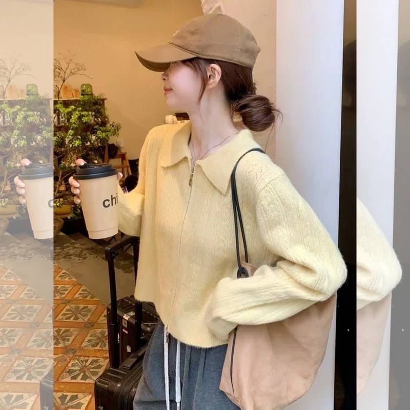 ポロ襟ニット イエローポロネックニットカーディガンレディース2025秋新作ダブルジップセーター