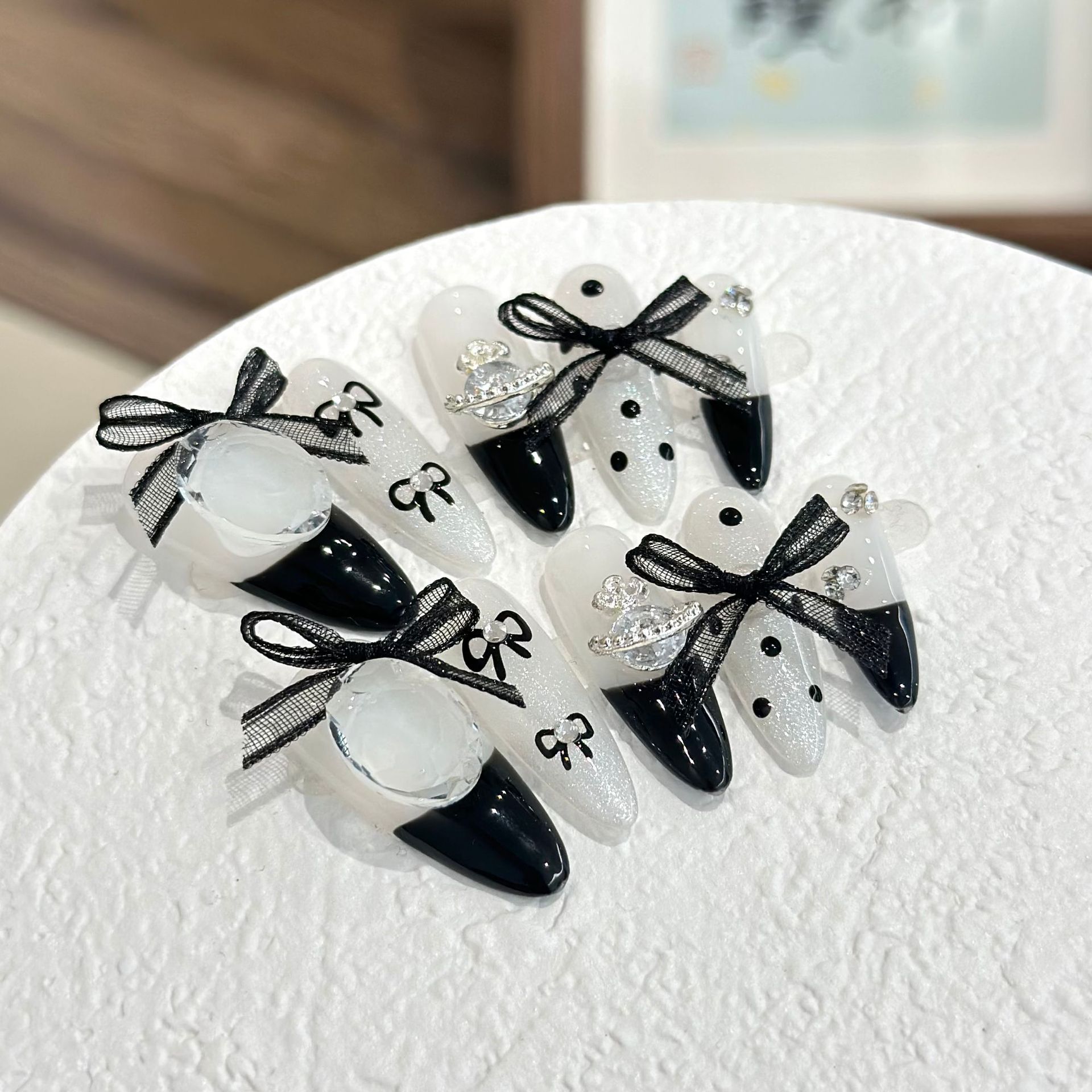 ネイルチップ 黒白フレンチネイル ミドルロングタイプレースリボン取り外し可能ジェルネイル完成品 精緻デザイン