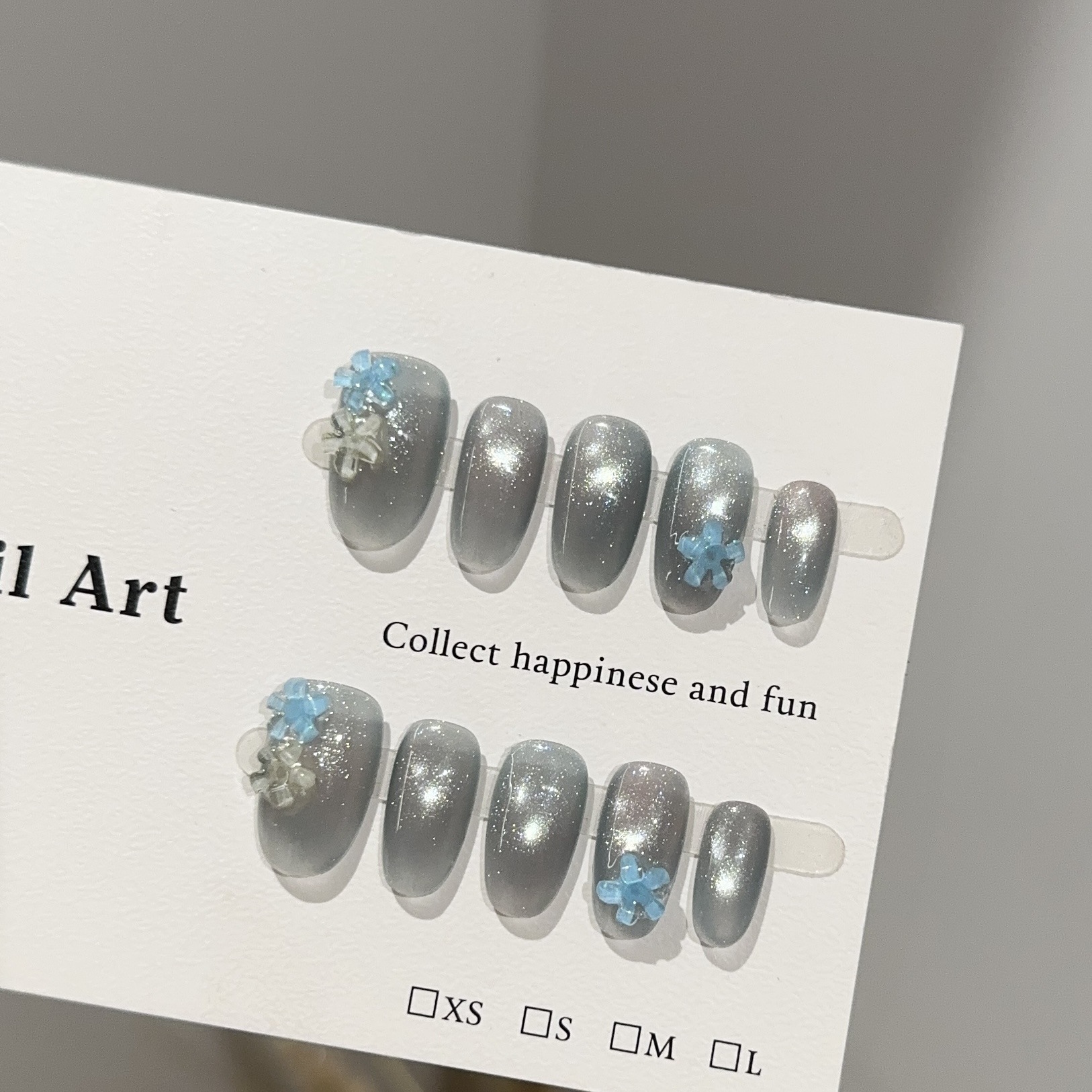 純手工ネイルチップ ハイクラス銀グレーキャットアイショートタイプ 立体小花朵フェイクネイル