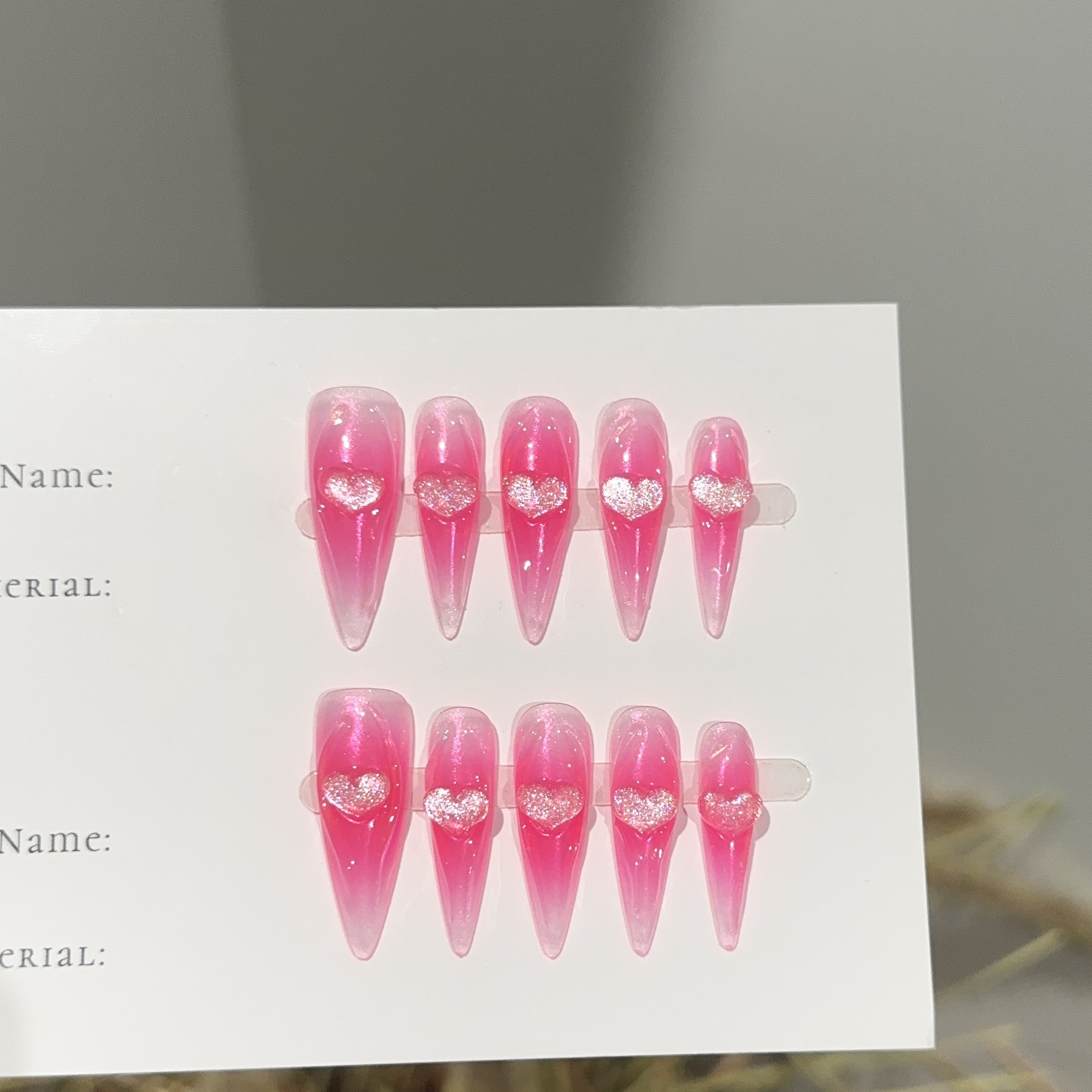 純手工ネイルチップ ハイクラス蛍光ピンクロングタイプ 欧米ハートフェイクネイル卸売