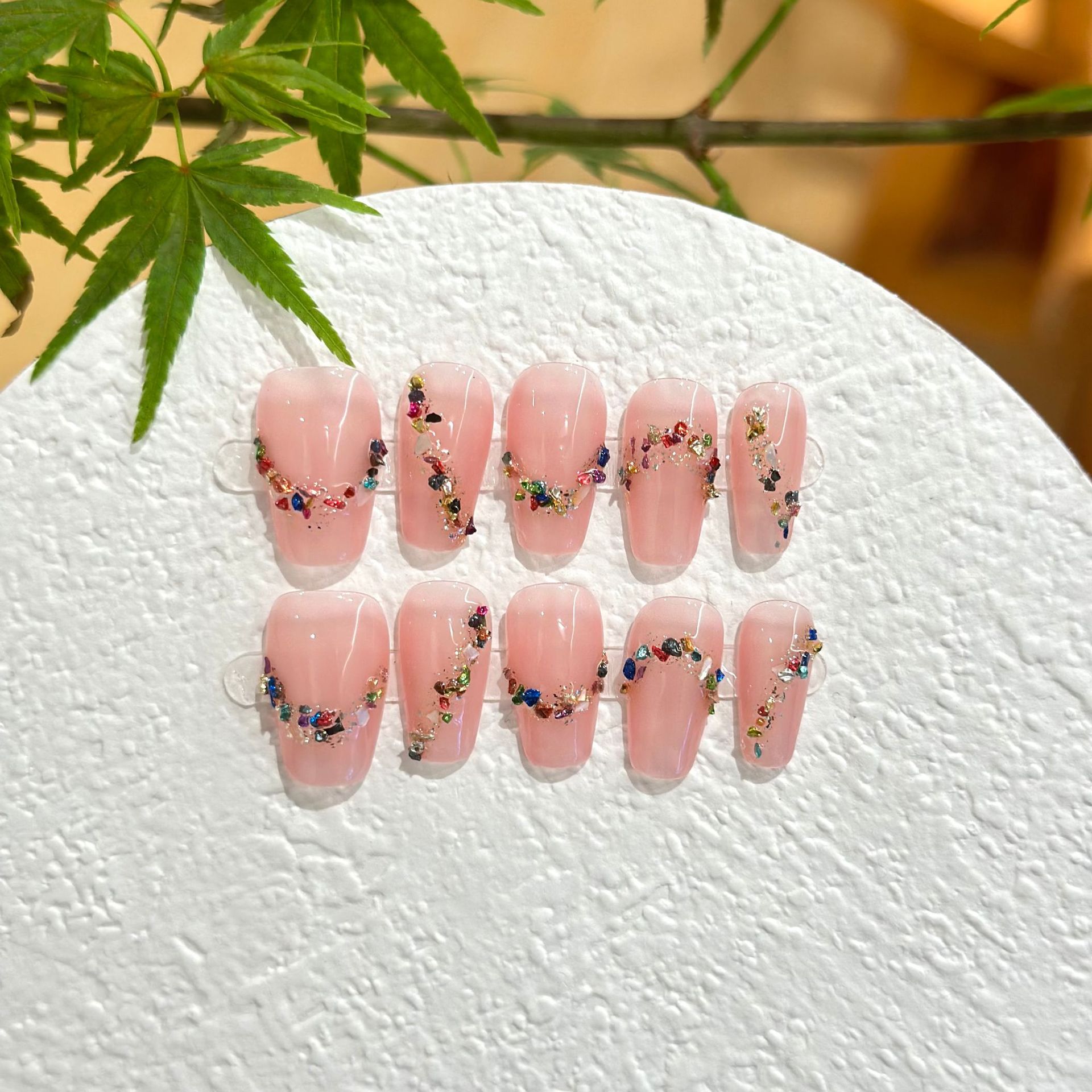 ショートタイプネイルチップ 手工カラーストーン着用式ネイル サマーハイクラスネイル フェアリースタイル 肌白く見せる 優しいデザイン