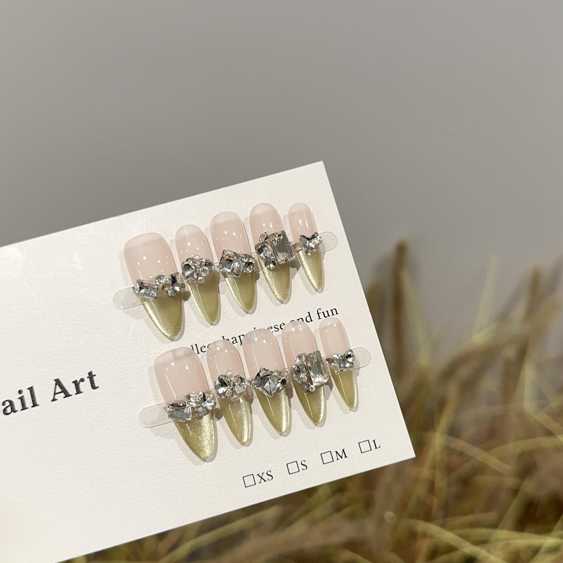 手工ネイルチップ ハイクラス緑キャットアイロングタイプ 肌白く見せるリミテッドラグジュアリーパール光ダイヤ積みフェイクネイル