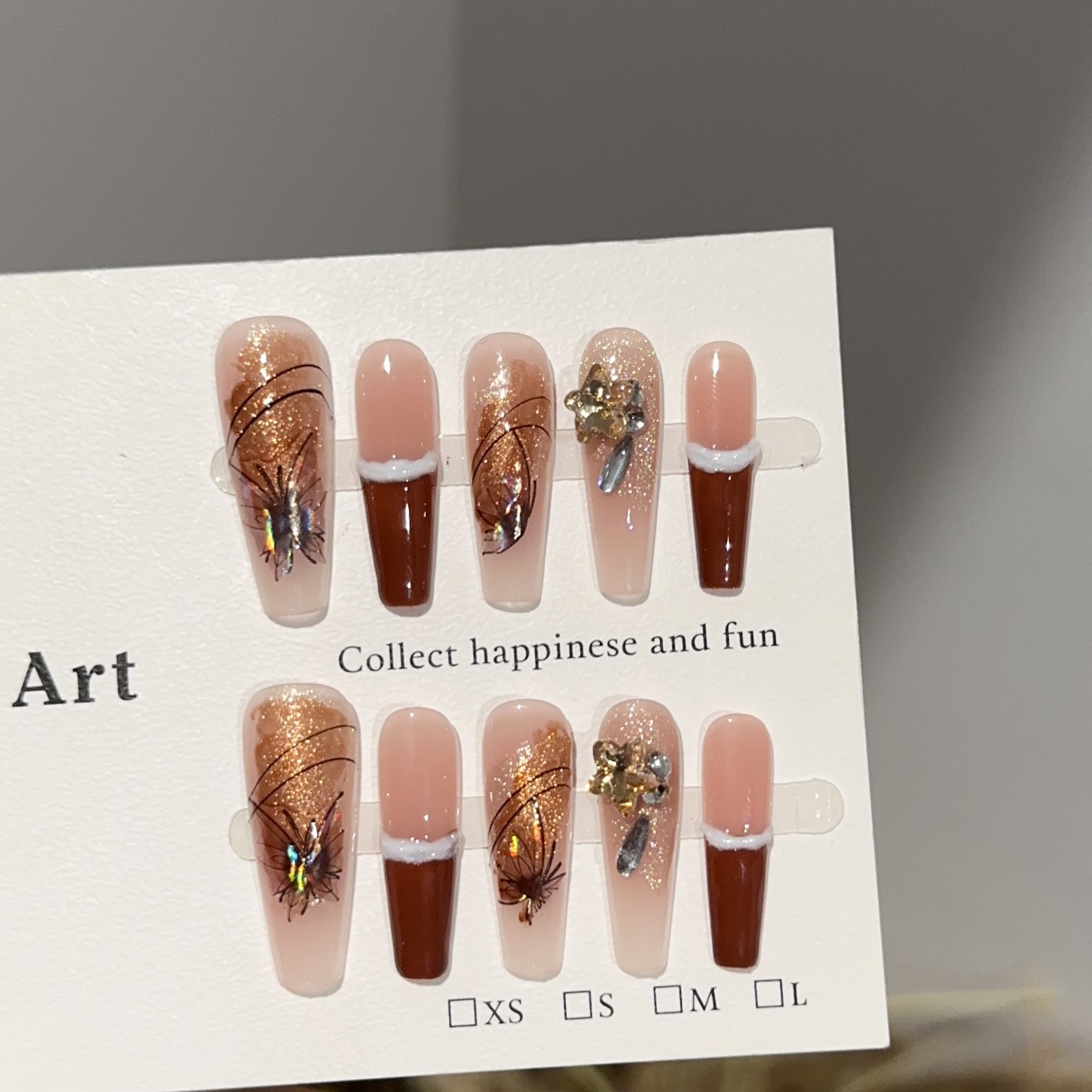 純手工ネイルチップ ハイクラス秋冬季メイラードバタフライネイル ロングタイプダイヤ積みフェイクネイル