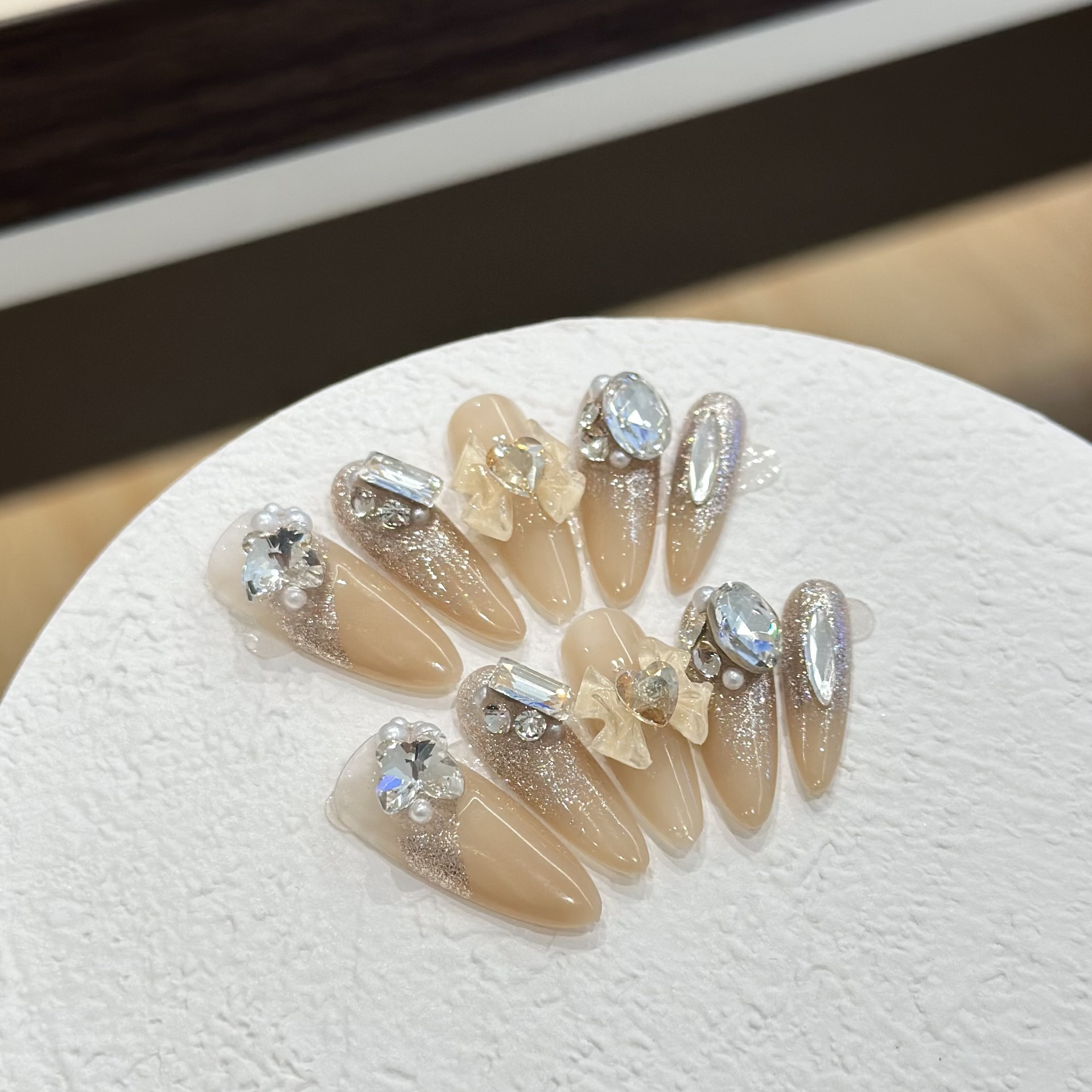 手工ネイルチップ ミルクティーイエローネイル リボンダイヤ付き 取り外し可能 ロングタイプポイントオーバル ジェルネイル完成品