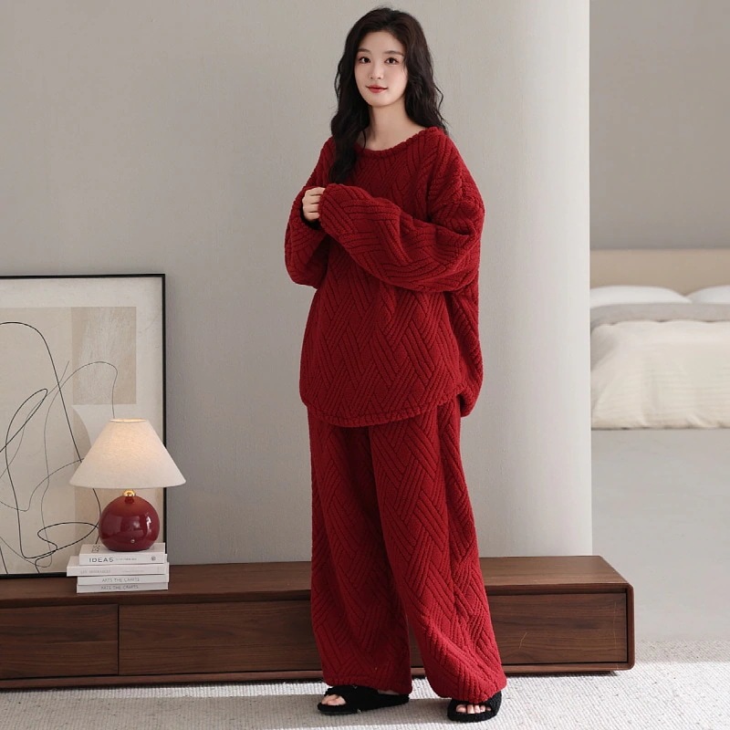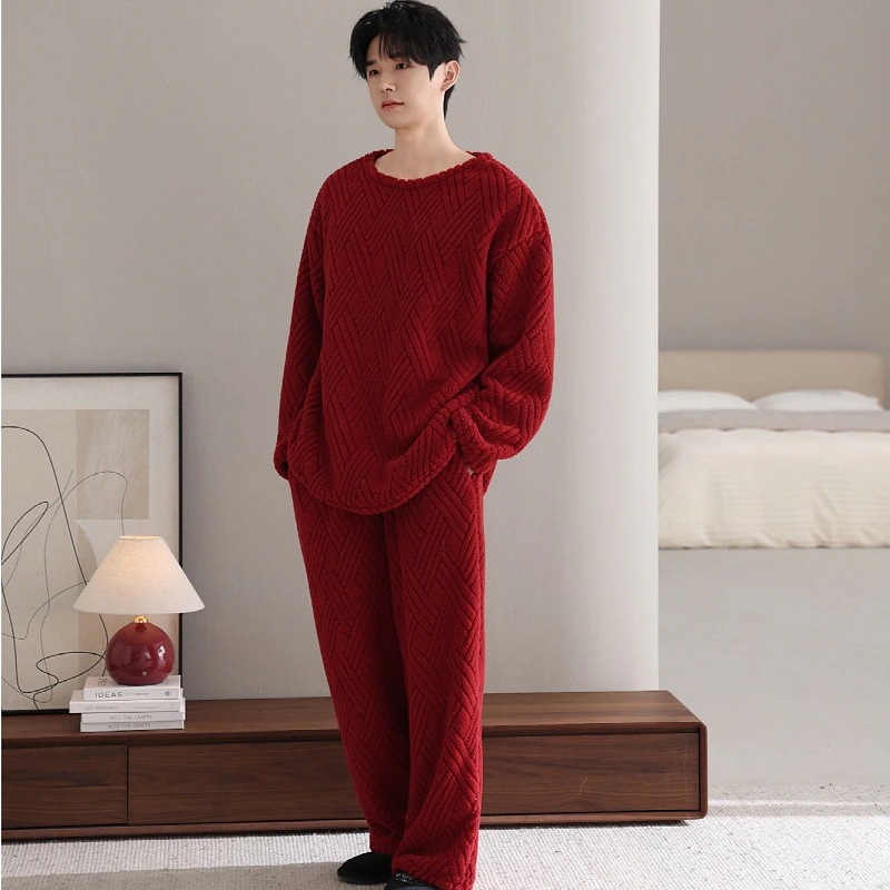 秋冬 パジャマ 上下セット カップル レッド 裏起毛 ルームウェア 厚手 セットアップ カップル レディース/メンズ