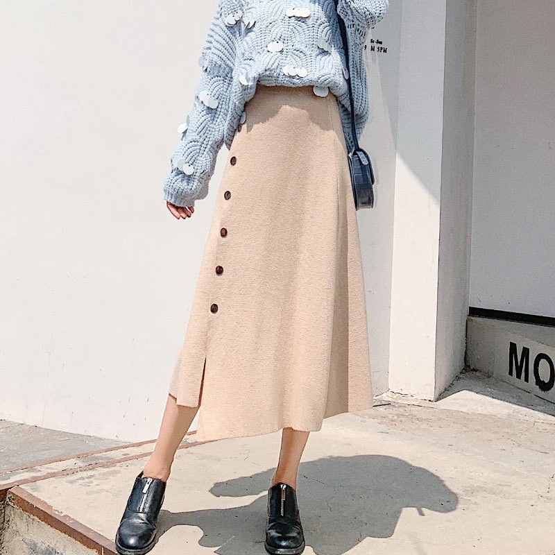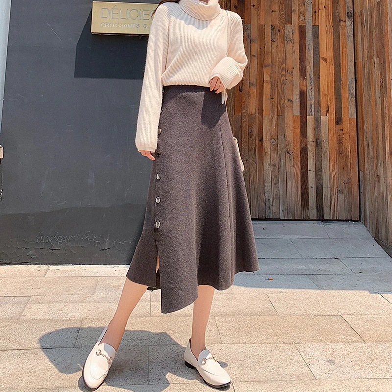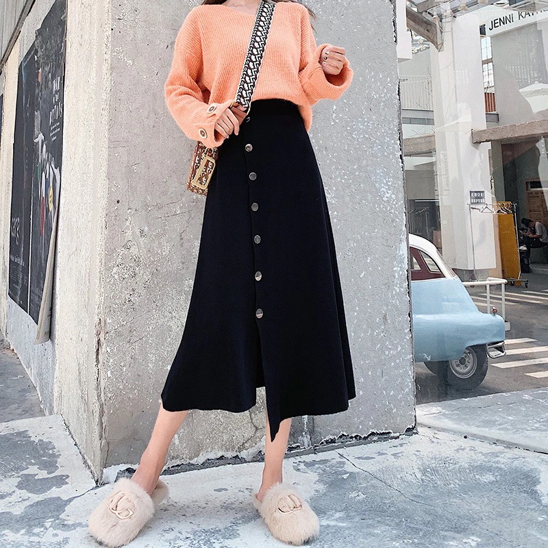 ニットスカート レディース秋冬2025新作 ハイウエスト 細身効果 ブラック フレアスカート ショート丈ミディ丈