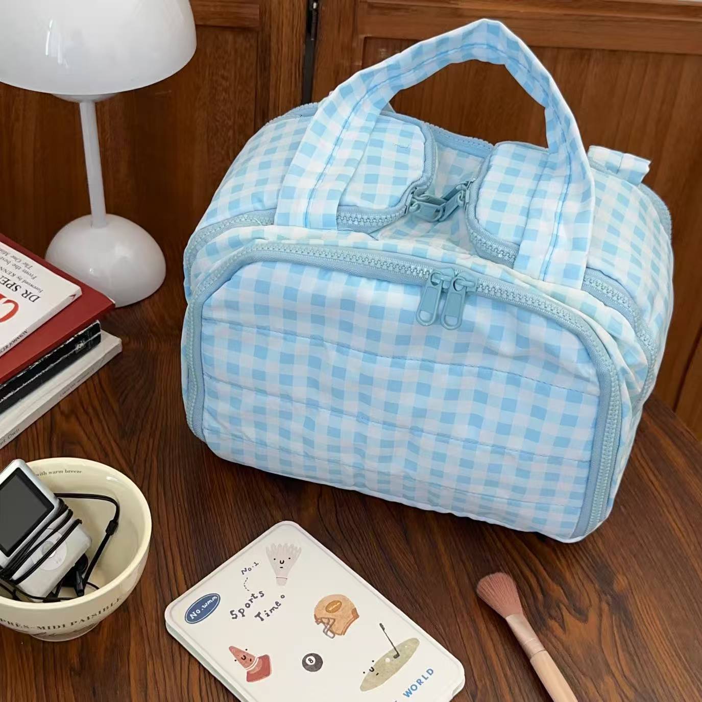 化粧ポーチ バニティ 大容量 ブルー ギンガムチェック シンプル 立体収納 旅行用 コスメポーチ レディース