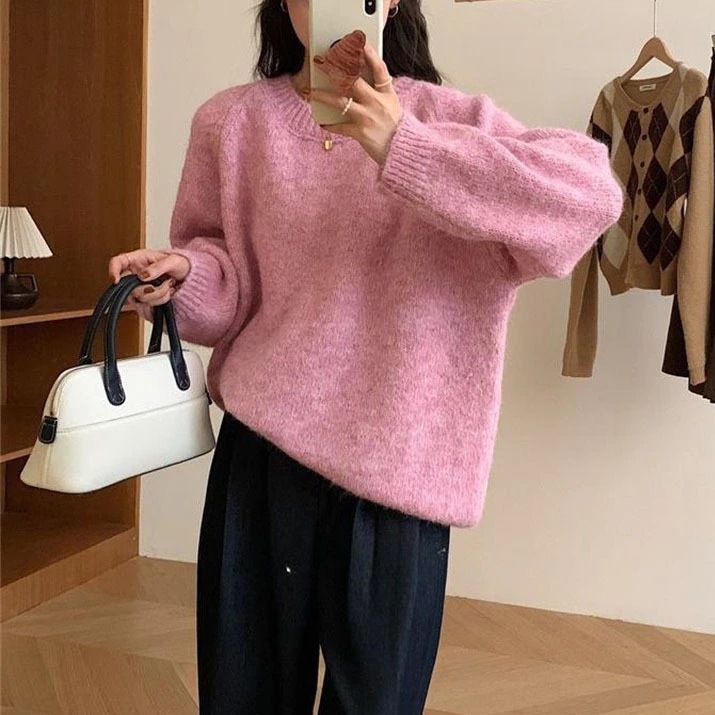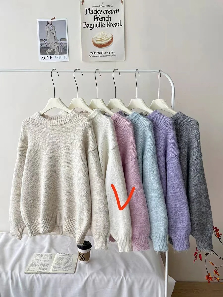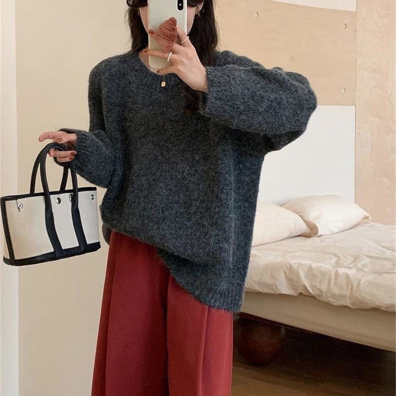 韓国系丸首プルオーバーセーター女 秋冬のけだるい風もふもふ長袖モチモチトップスゆったりオーバーサイズニットセーター