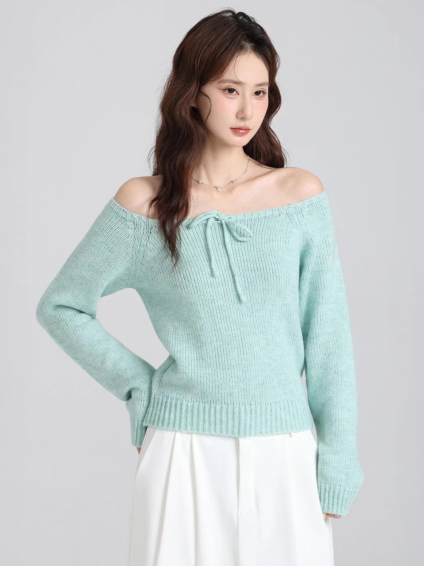 【人気商品】緑のワンワードネック肩出し長袖セーター秋冬新作だるい高級感のあるバンドインナートップス