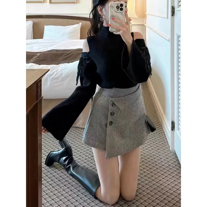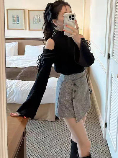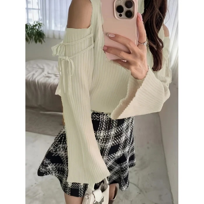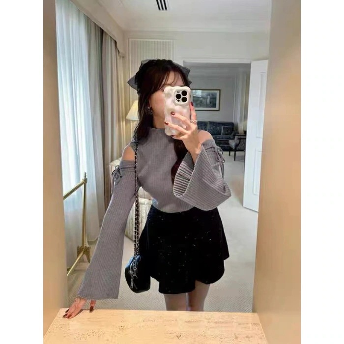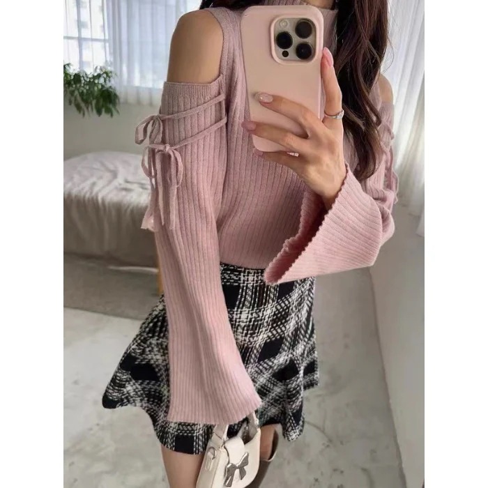 【人気商品】上品な秋冬の新作ポンチョリボンハイネック肩出しフレアスリーブニット