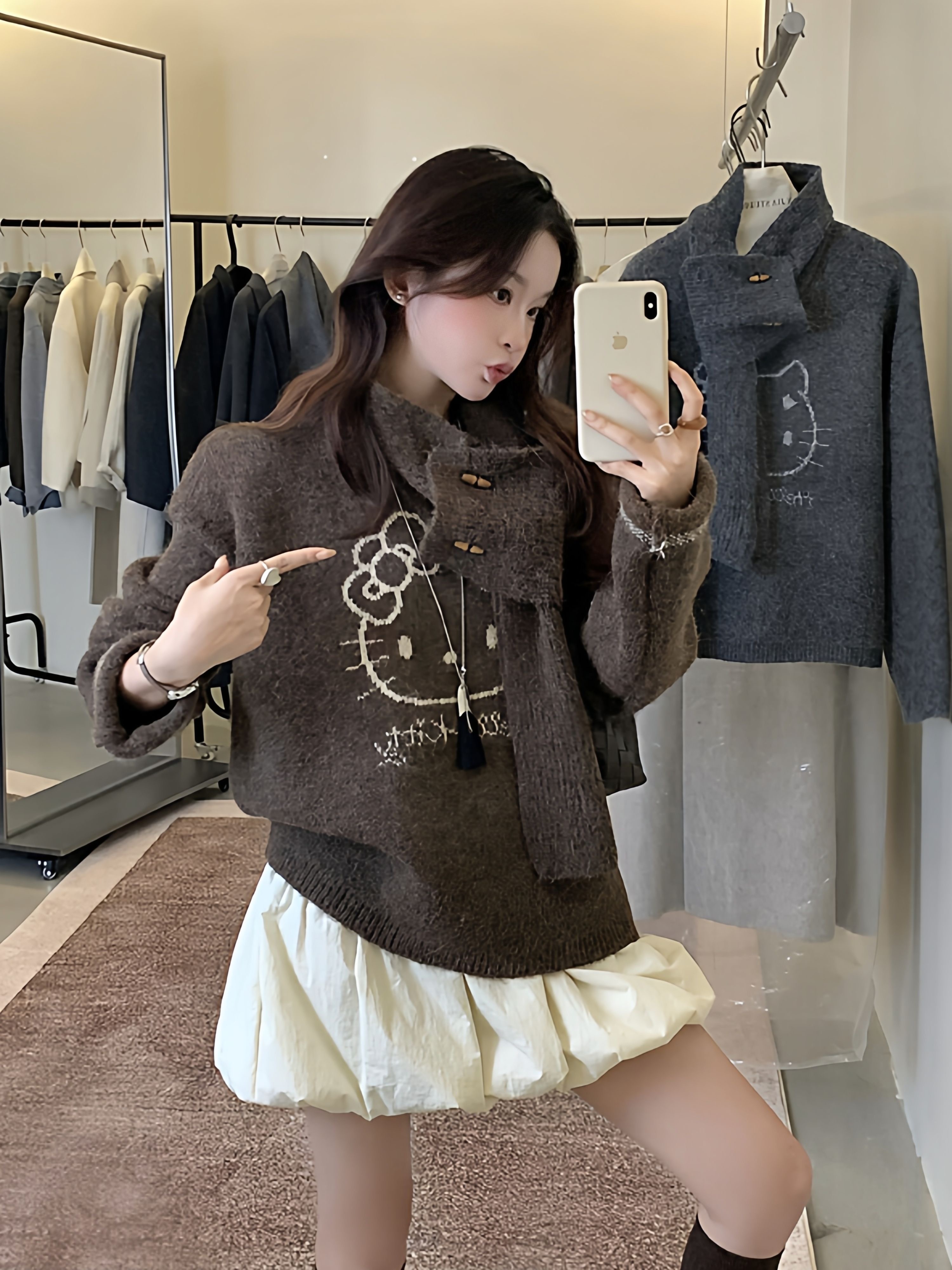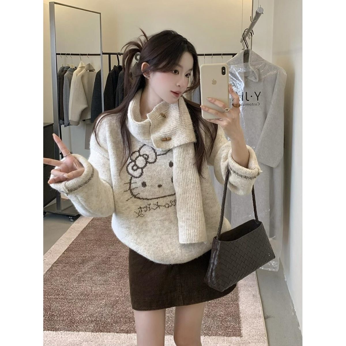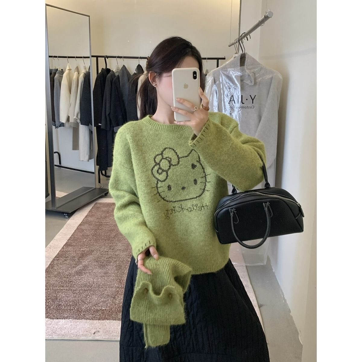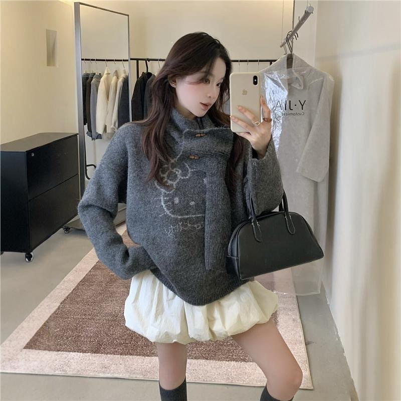 【2026年人気新作】キティ レトロ 韓風デザイン カラーブロック コントラストステッチ 丸ネック 刺繍 トレンディーで万能搭載 もちもち質感 プルオーバーセーター