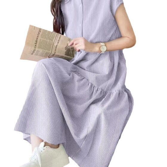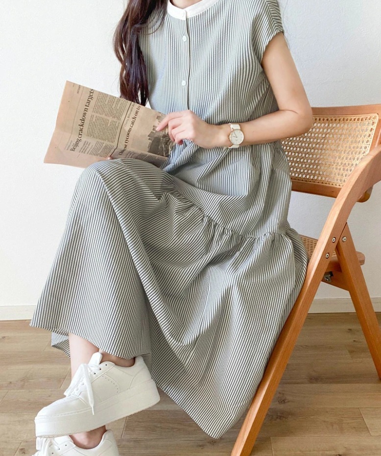 夏/ラウンドネック/三つボタン/ストライプ/ノースリーブワンピース/ロング/半袖/スタンドカラー/ワンピース/レディース