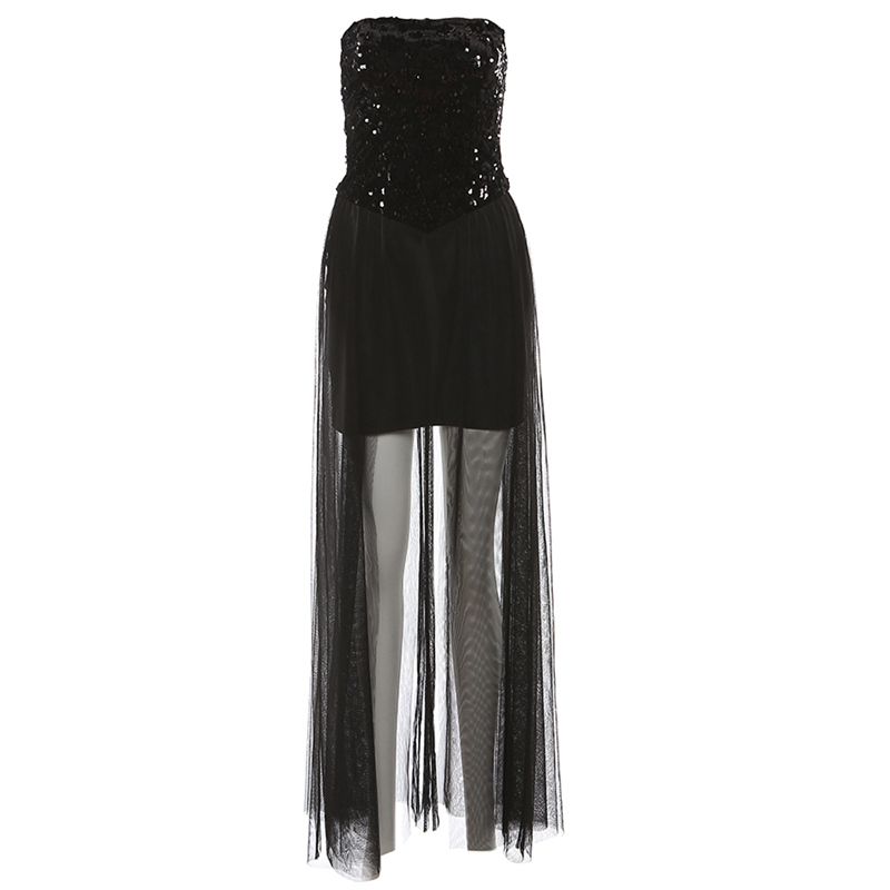 パーティードレス ラインストーン付きレディライク軽奢華シースルーパッチワークウエストマークブラックワンピース