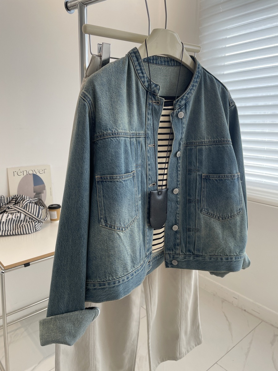 レトロな水の先の青い立襟のデニムのショートコートの女性! 春の韓国版はやせています
