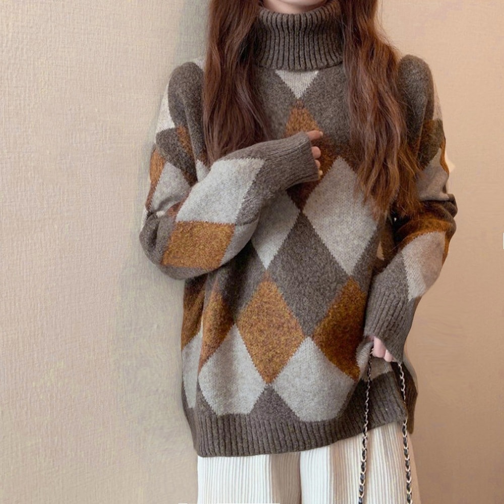 タートルネックニットトップス アーガイル