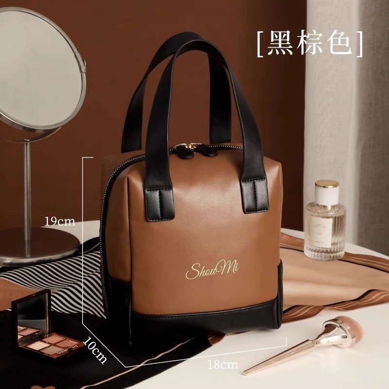 秋冬用PUカラーブロック化粧ポーチ携帯用旅行収納バッグハンドバッグ大容量洗面用具ケース