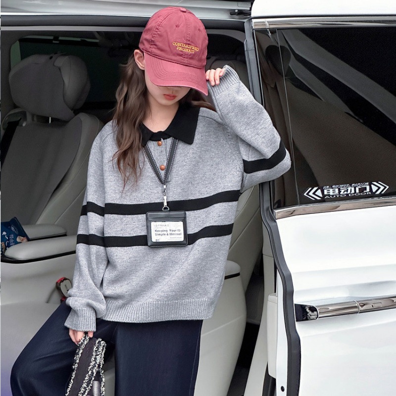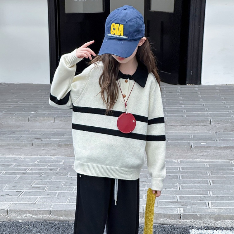 色合わせの襟折りのセーターのプルオーバー秋冬の新型の洋気の子供のニットのゆったりした中の大きい子供の底のシャツ