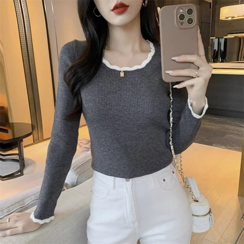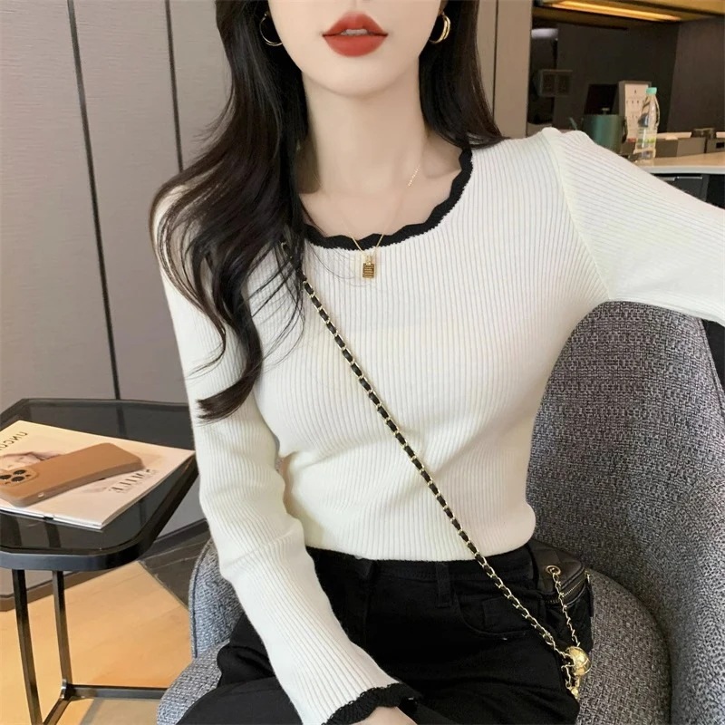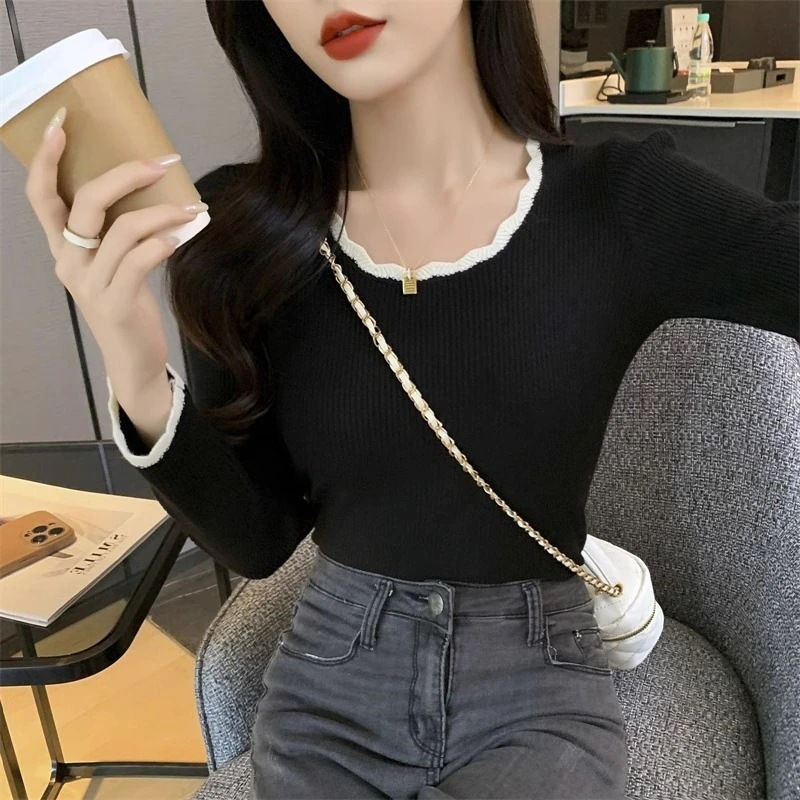 フリル付き インナー 着痩せ シンプル 長袖 カジュアル ファッション 秋の準備!ニット セーター トップス トップス 無地