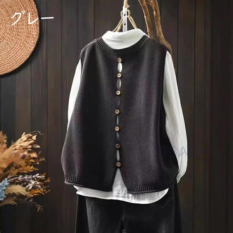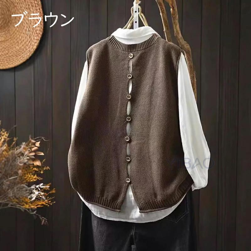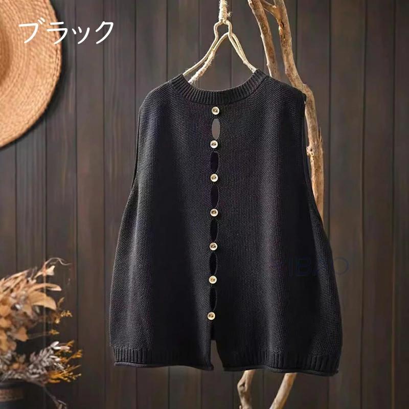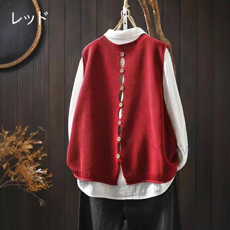 クルーネックベスト 秋 レディース バックボタンのデザイン シンプル ノースリーブ プルオーバー 【30%OFFセール】ニットベスト ゆったり 無地 ショート丈 トップス ニットベスト