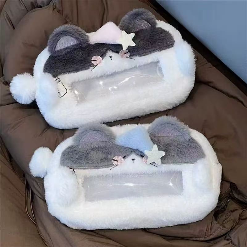 ぬいぐるみ猫ペンバッグかわいいぬいぐるみ文房具大容量可窓文房具収納袋痛層化粧バッグ