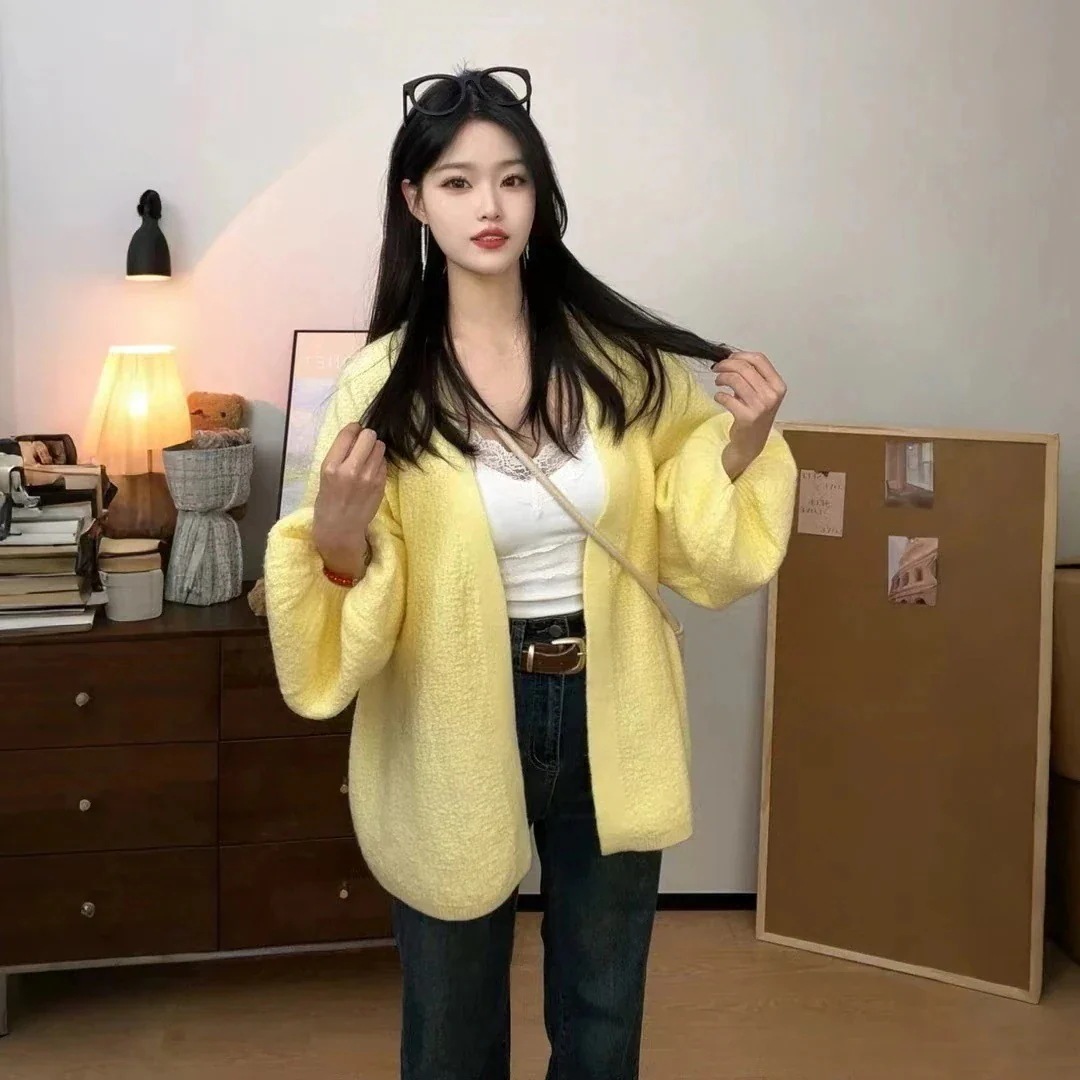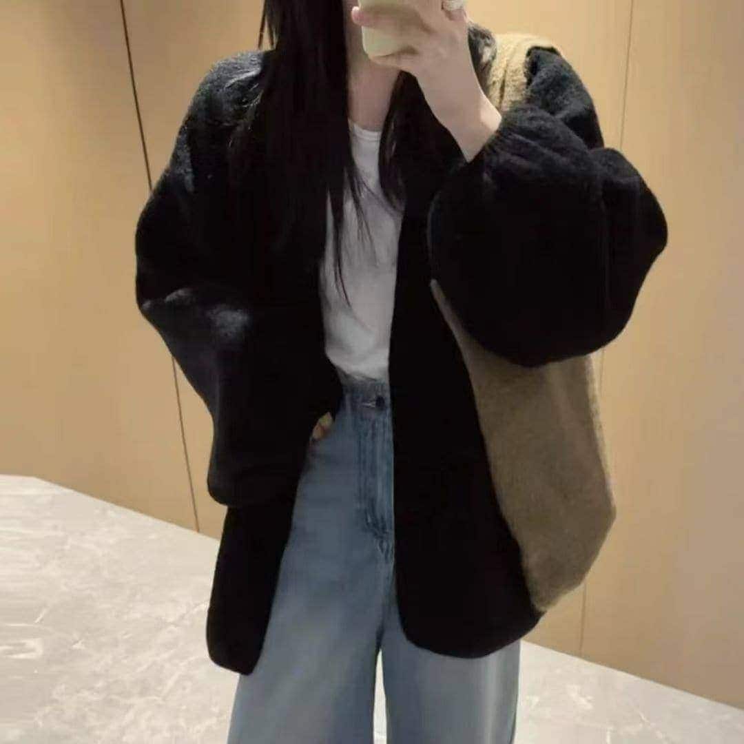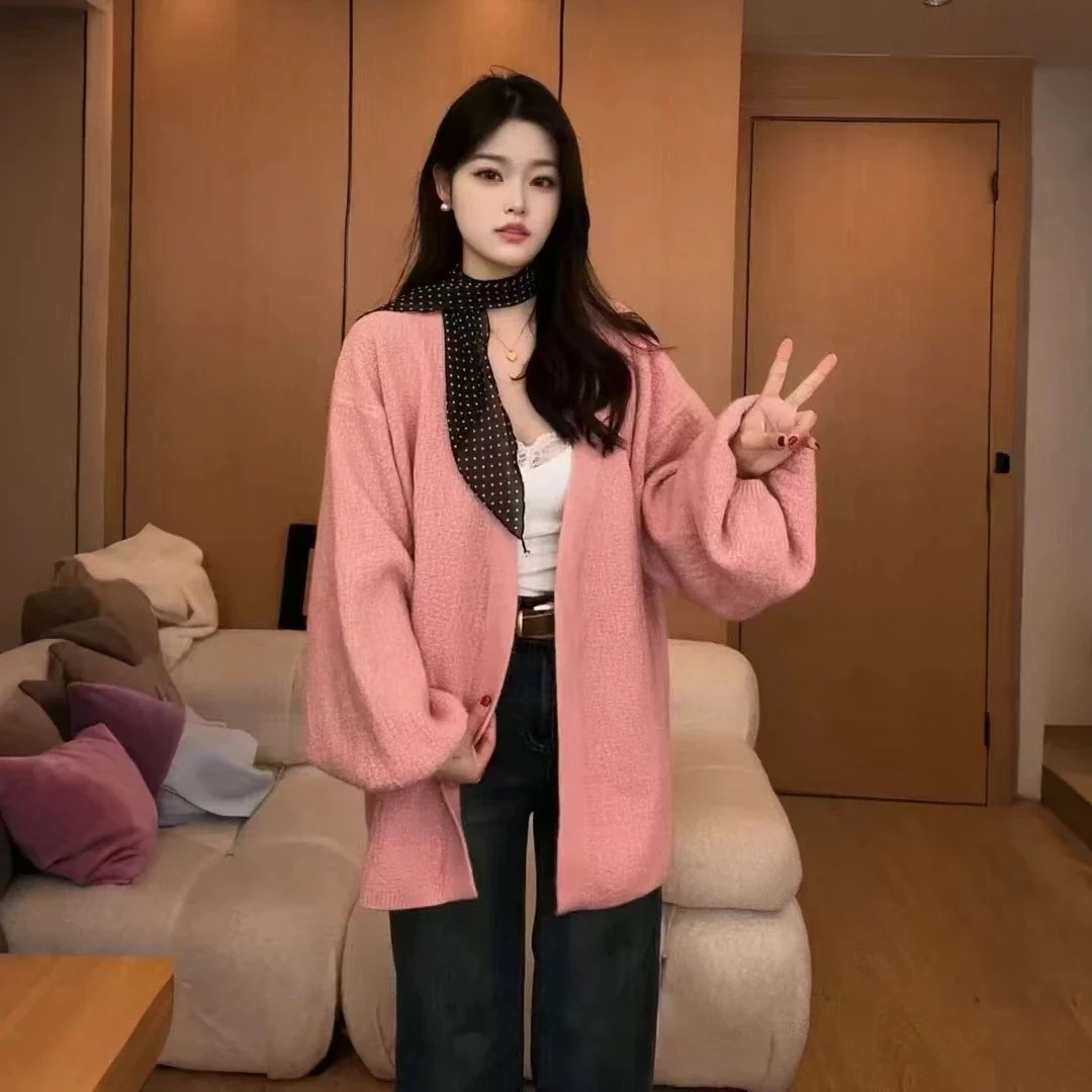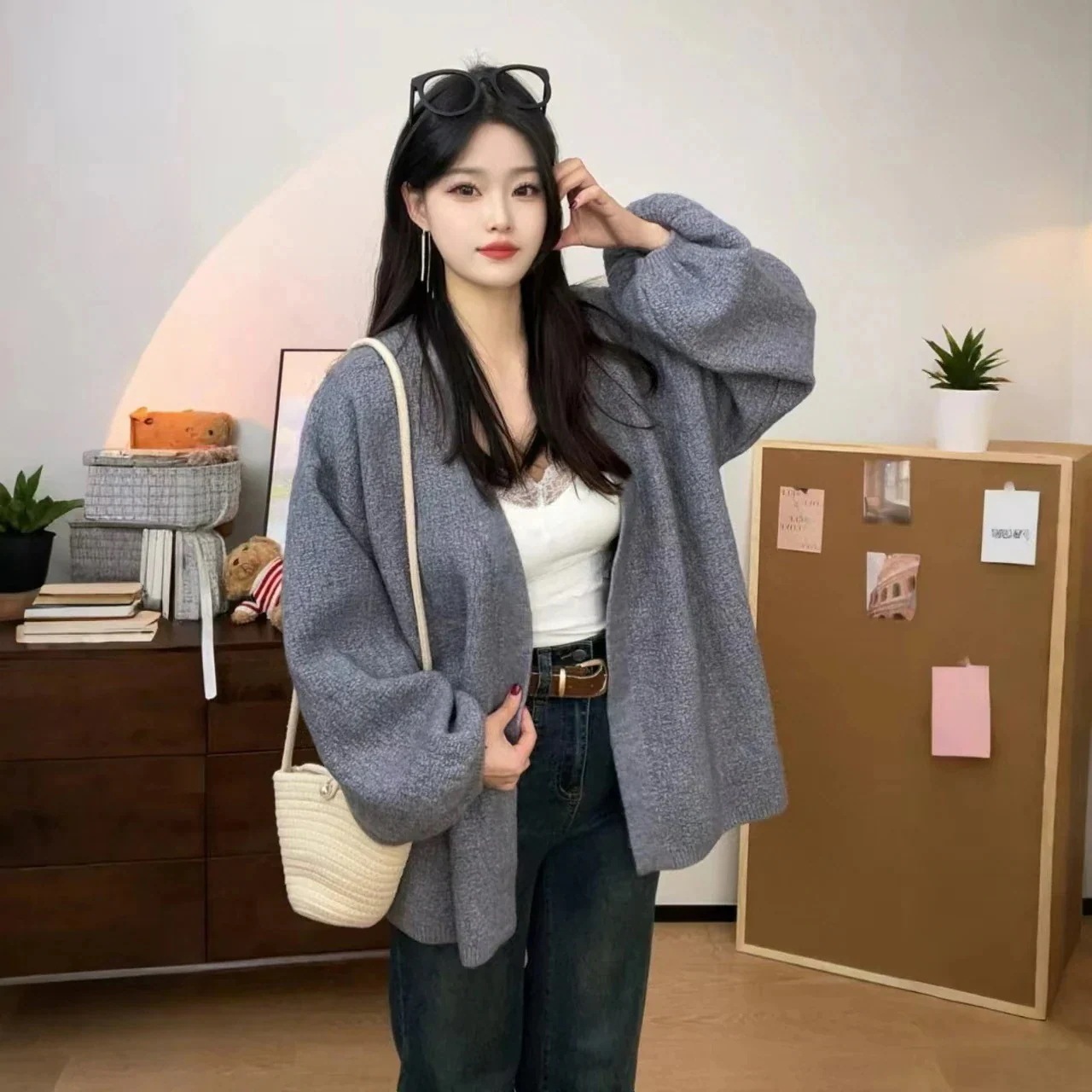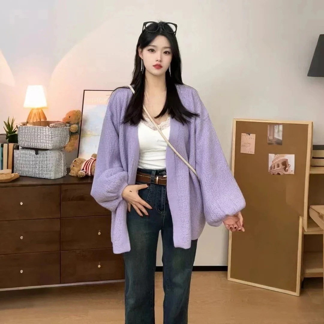 春秋向けゆったりニット(ボタンなし)レディース 太針編みデザイン ファッショナブルなベルスリーブ アウター ニット