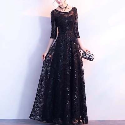 【ウェディング / キャバ / ステージ用】ロングマキシイブニングドレス 膝下丈 7 分袖ラウンドネック プリンセスラインフレア A ライン レースエレガント