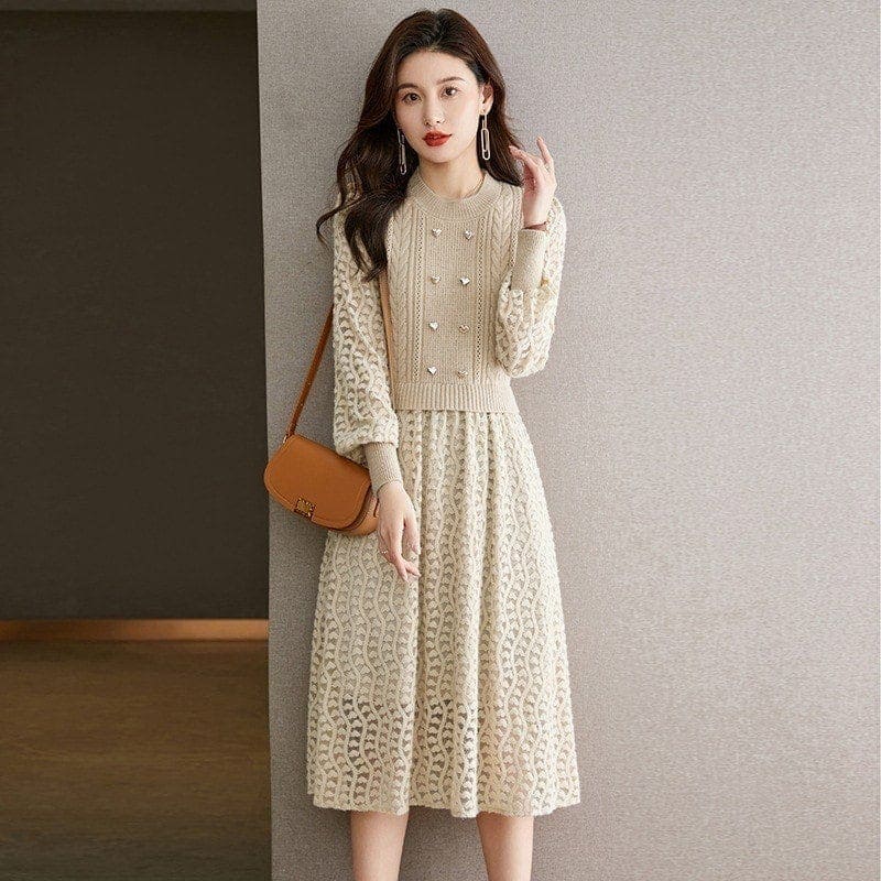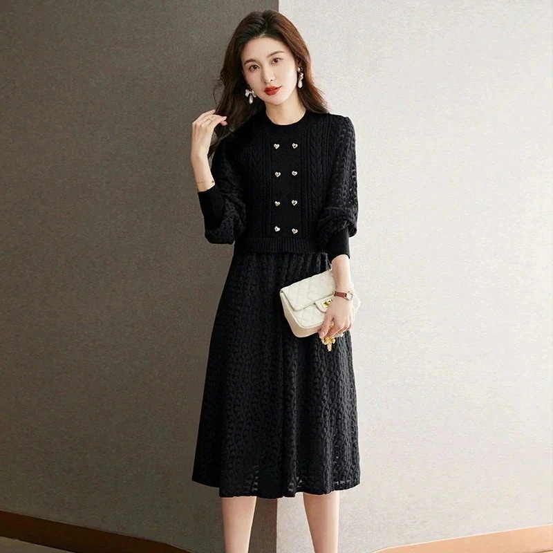 お呼ばれドレス ニットドレス ワンピース パーティードレス 韓国ファッション 韓国ニットフェイクツーピースドレス秋冬新作ファッションハイウエストランタンスリーブロングセータードレス