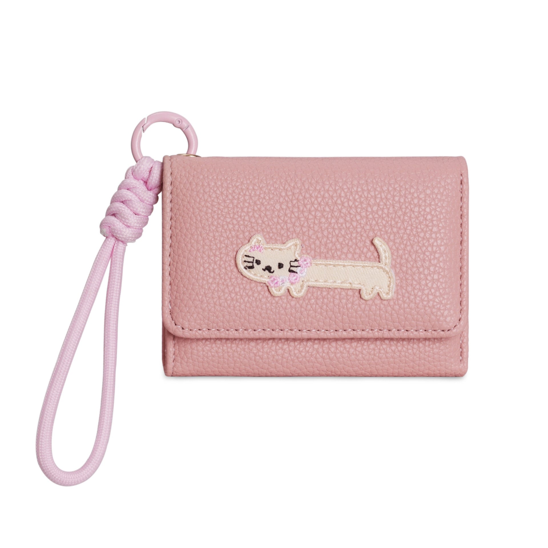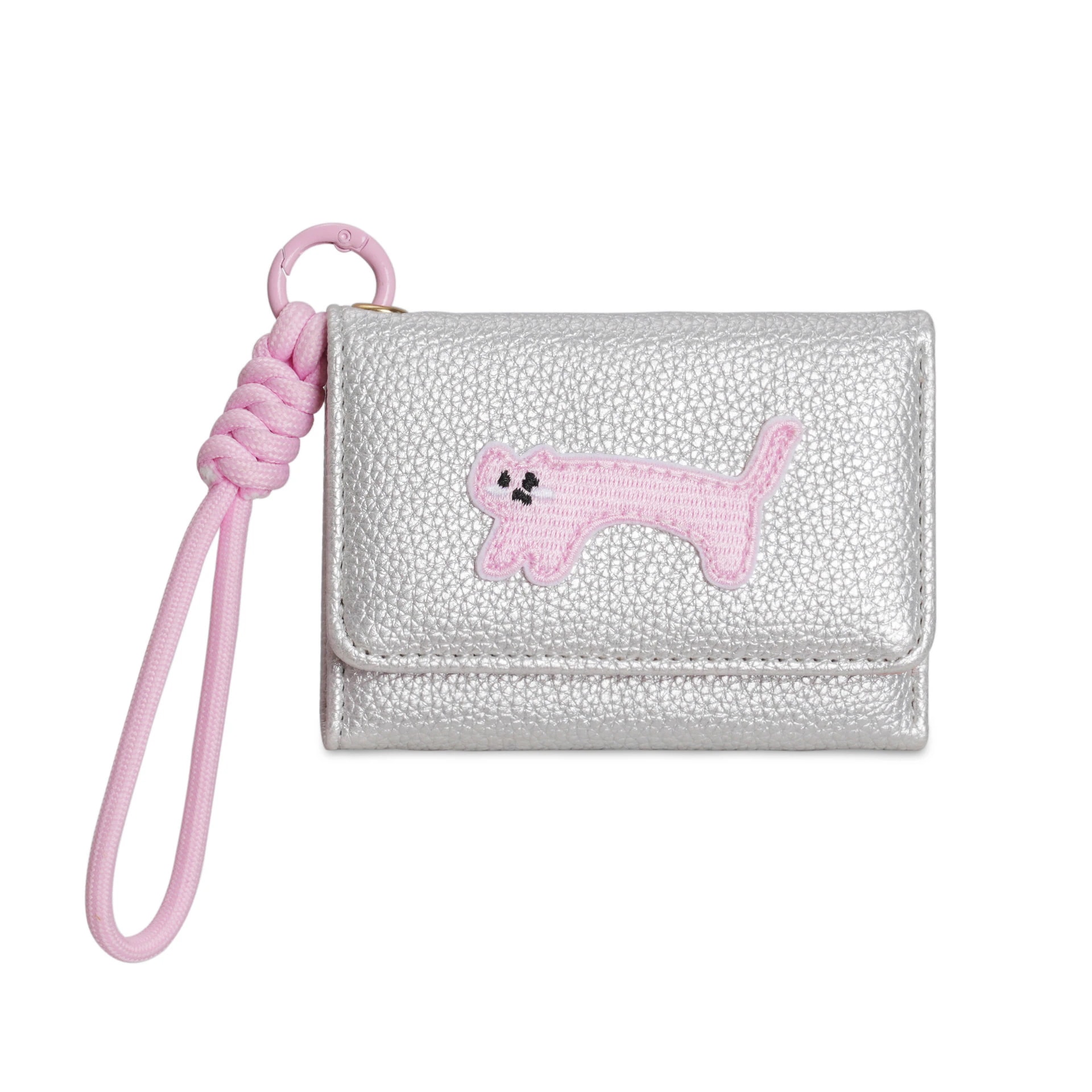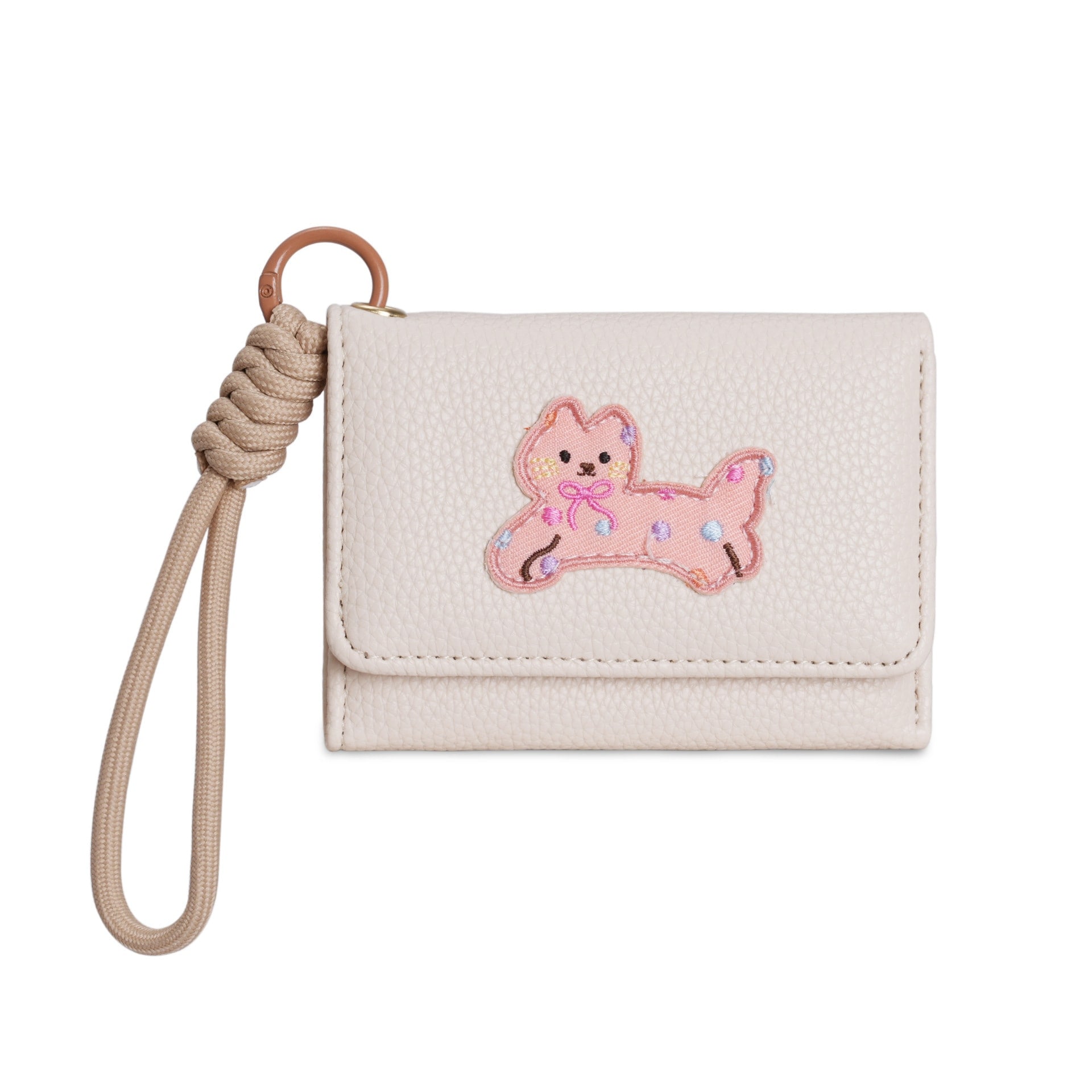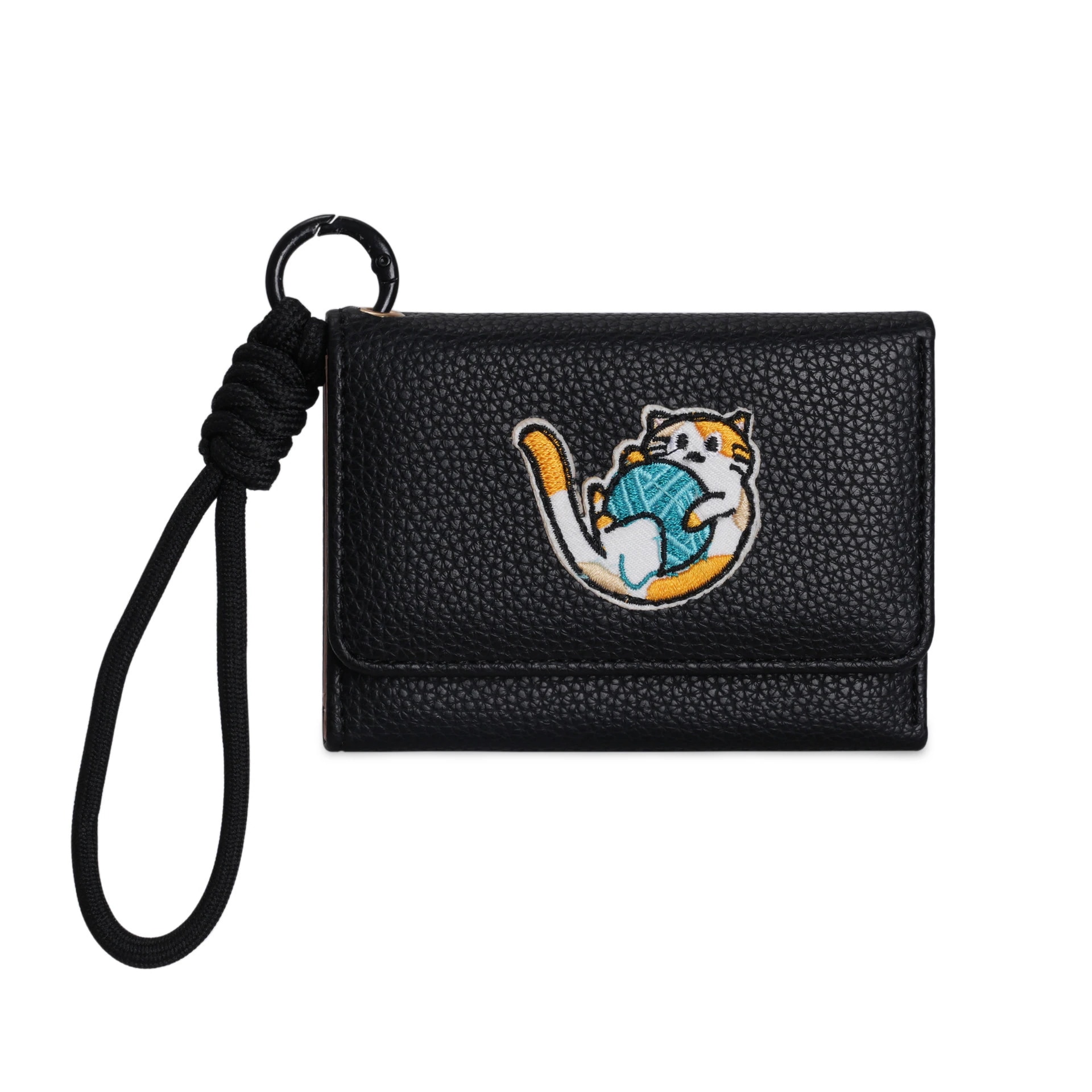 韓国版新作アニメ風 可愛いパッチワーク猫チャーム付きストラップバッグ三つ折りショートタイプ レディース財布