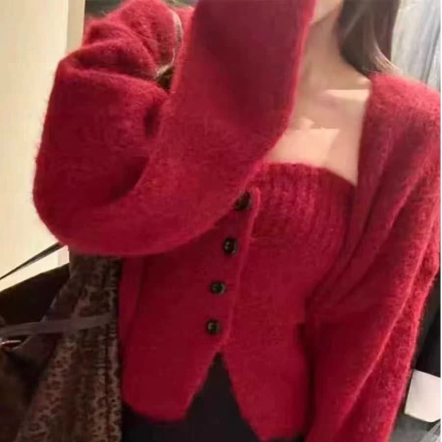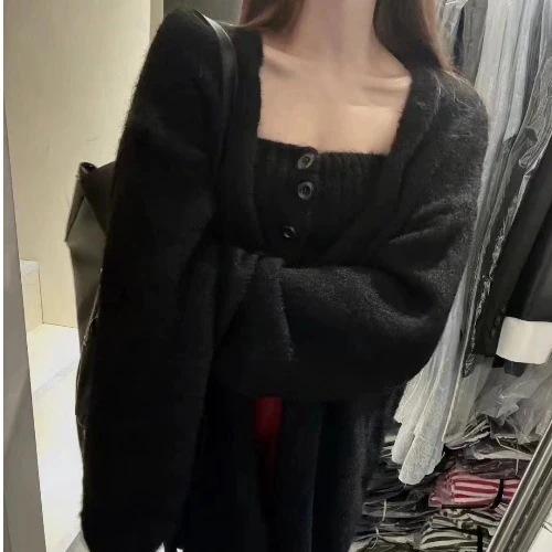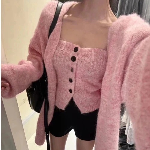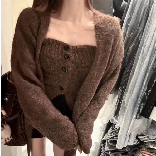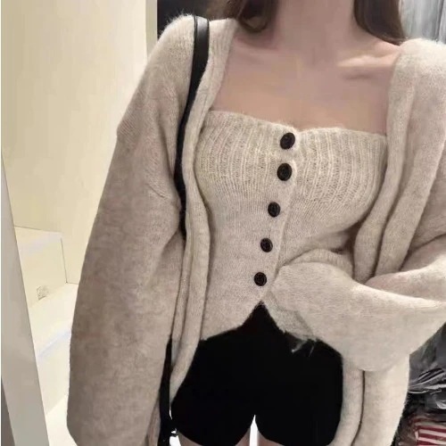 韓系2枚セット太針シングルブレスト胸巻き+ゆったりけだるい風セーターコート アルパカカーディガントップスニットカーディガン
