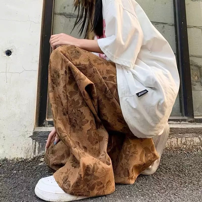 2025秋冬 再入荷 パンツロング丈ストレート 3XL展開ウエストゴムハイウエストゆったり総ボタニカルプリント春カジュアル韓国系ファッションレディースイージー花アーバンなお出かけおしゃれかわいい衣装