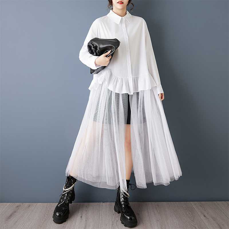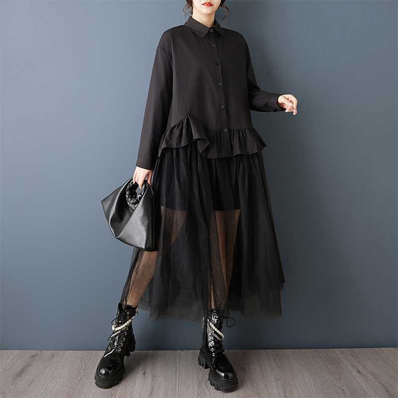 【Noir Archive】 春秋 韓国風 チュール 切り替え 無地 長袖 ワンピース シャツワンピース デザイン性 ブラックコーデ 大きいサイズ レディース 体型カバー ロングワンピース ワンピース