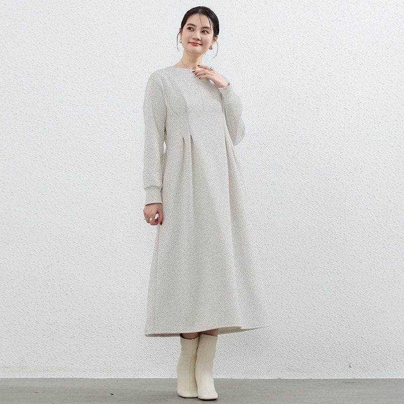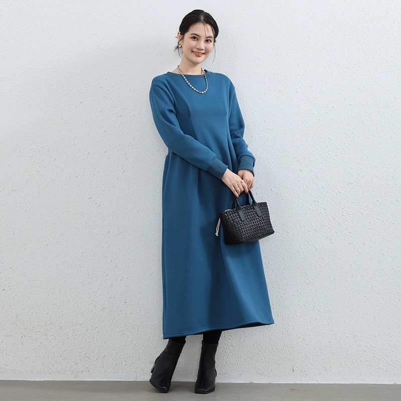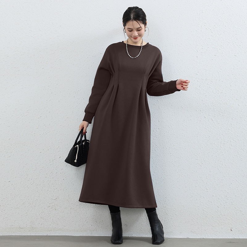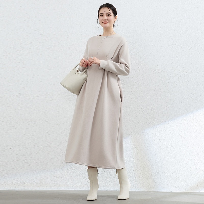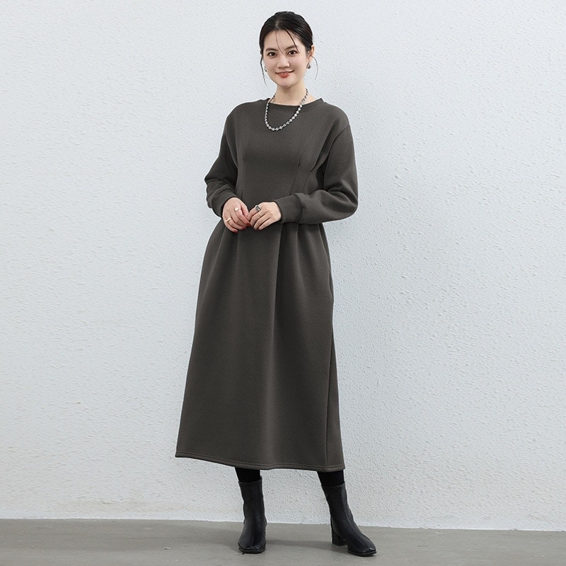 秋冬ピュアカラーギャザーワンピース ゆったりベルトポケットカジュアル丸首パーカーロングスカートロング・長袖