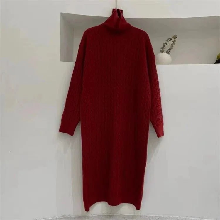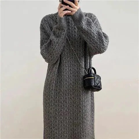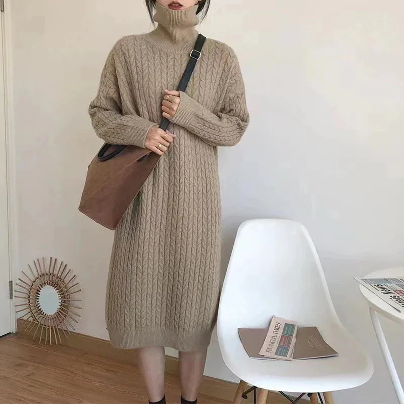 ハイネックロング麻編みスカート女 韓国版ゆったり厚手保温セータースカートロング丈膝丈ワンピース潮長・長袖