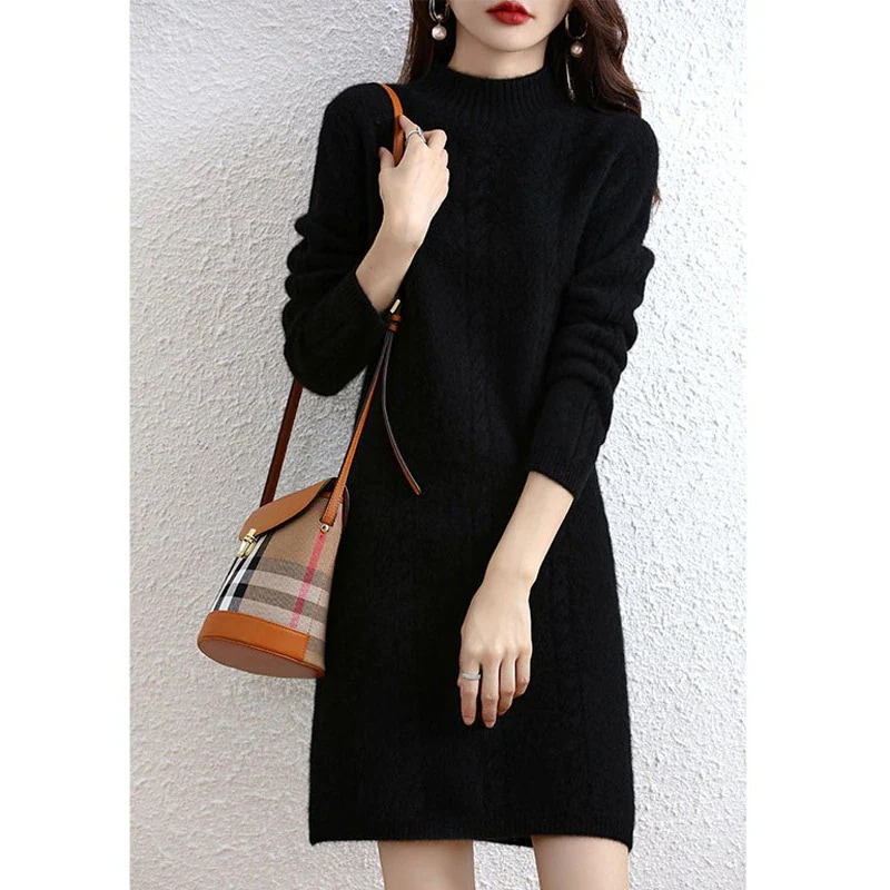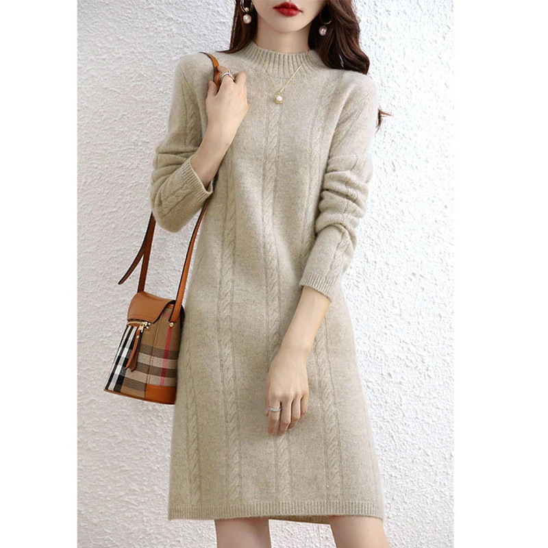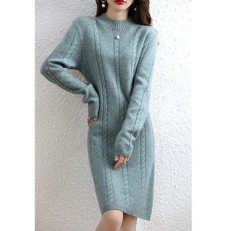 ロングニットワンピースハーフハイネックレトロ麻花ガール 秋冬ボトムコート厚手プルオーバーニットウールスカートロング・長袖