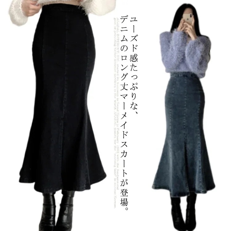 マーメイド スカート デニム ロングスカート タイトスカート フレアスカート フリル ロング おしゃれ かわいい レディース ボトムス ジーンズ きれい マーメイドライン ハイウエスト ストレッチ 美