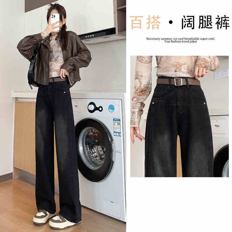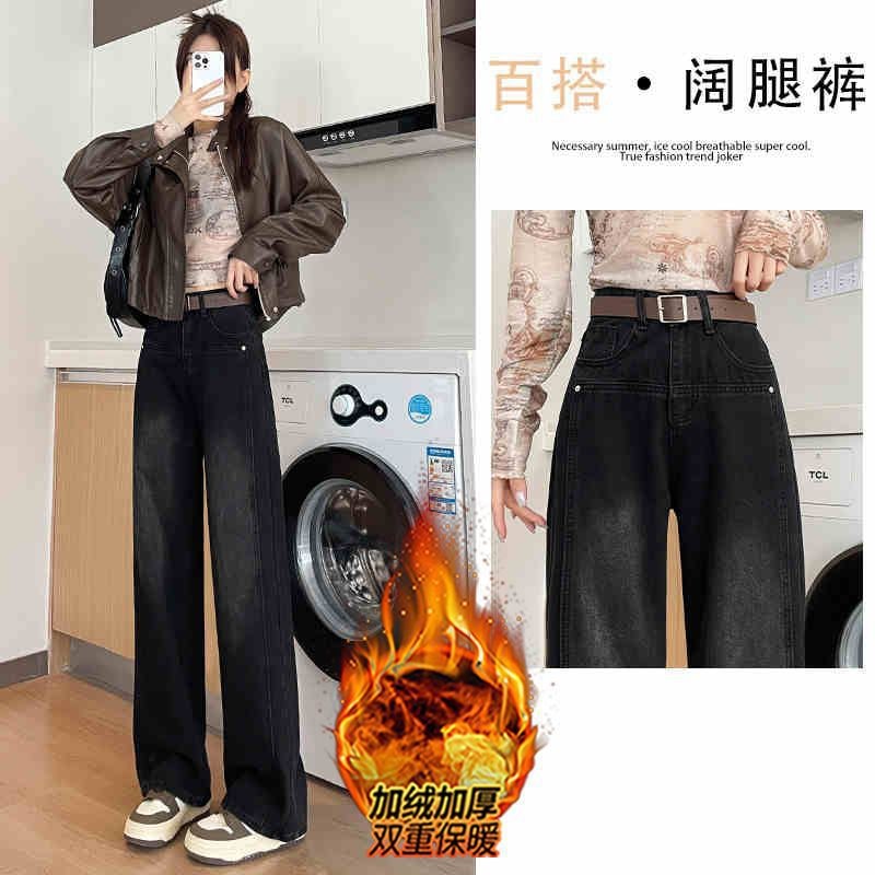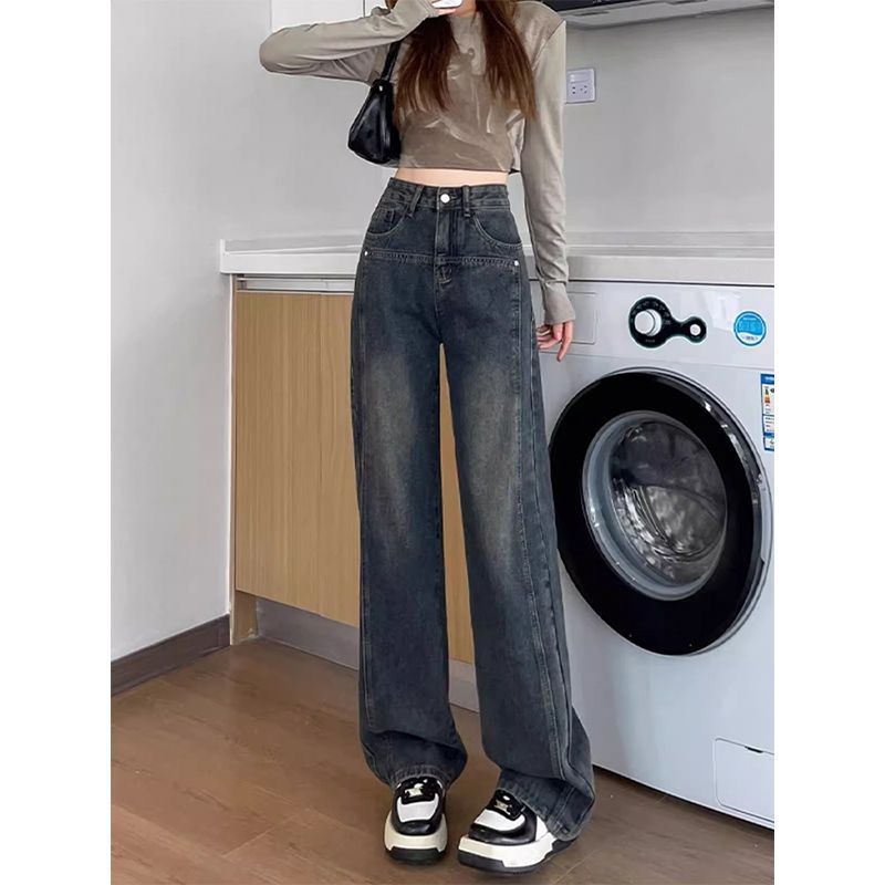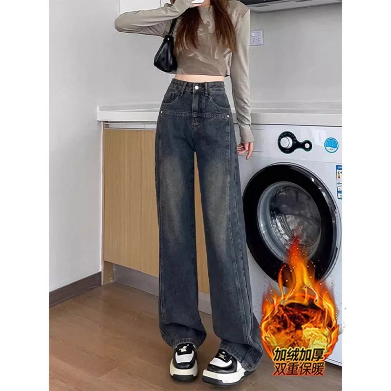 コンクリートグレー ハイウエスト スリムフィット ワイドレッグ ジーンズ 女性用 裏地付き 厚手 小柄 細身 ストレートパンツ