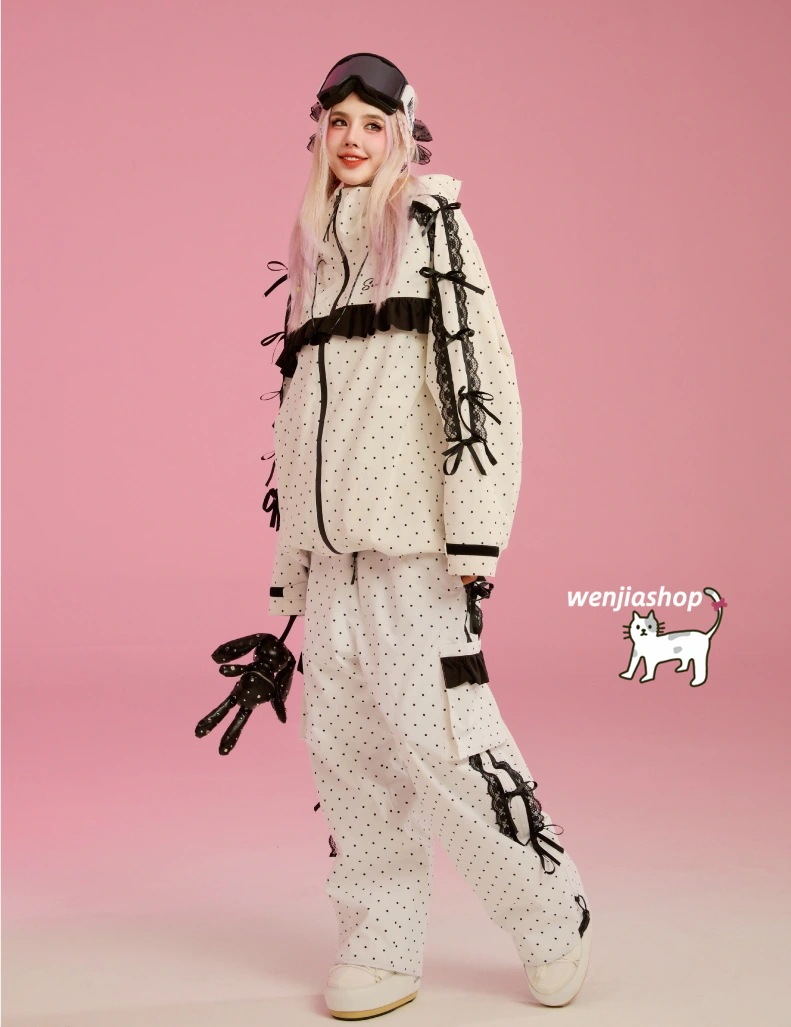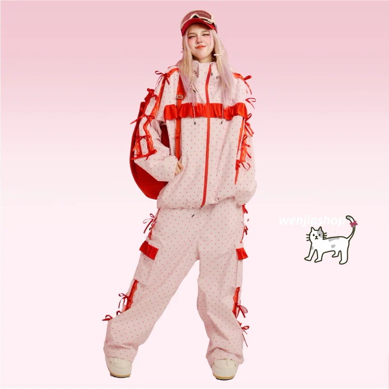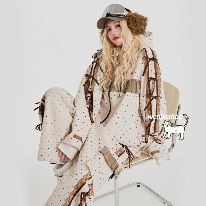 スノーボードウェア 2026 上下セット 耐水圧20000 メンズ レディース ジャケット パンツ ズボン レース リボン ドット柄 3L 裏起毛 韓国風 スノボウェア スノーウェア スキーウェア