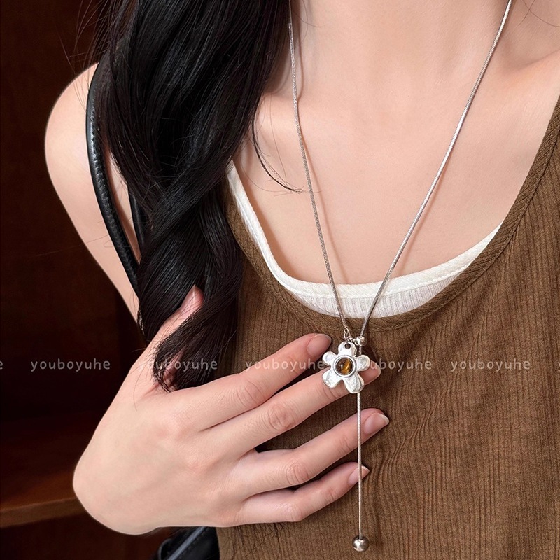 復古虎眼石花引き式ネックレス女性2025年秋冬モデルの新型セーターのガードルチェーン