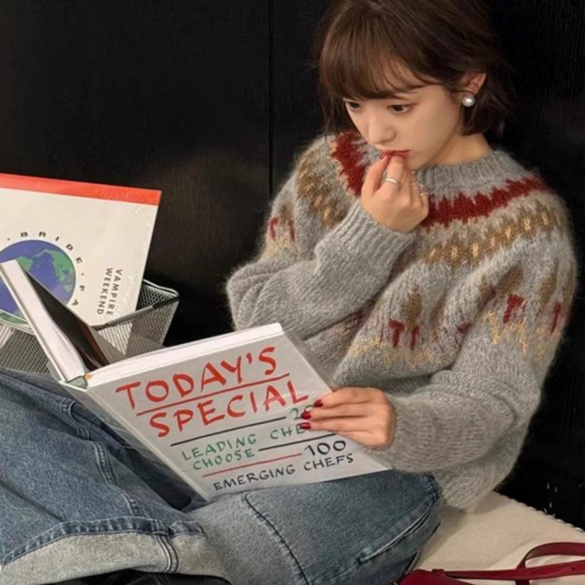 【2026厳選シャギーニット】 グレー フェアアイル ニット モヘア ジャカード セーター レディース 秋冬 クリスマス ウェア ルーズ スローチー トップス 韓国ファッション