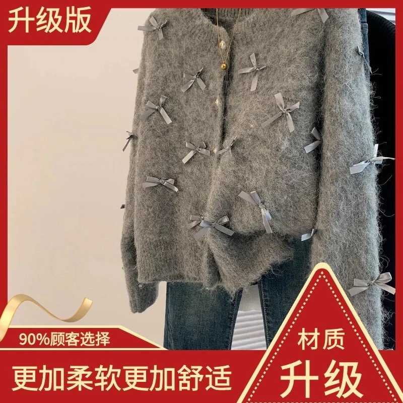 【2026厳選シャギーニット】 グレー リボン モヘア セーター レディース 秋冬 新作 デザイン ニット カーディガン 韓国ファッション