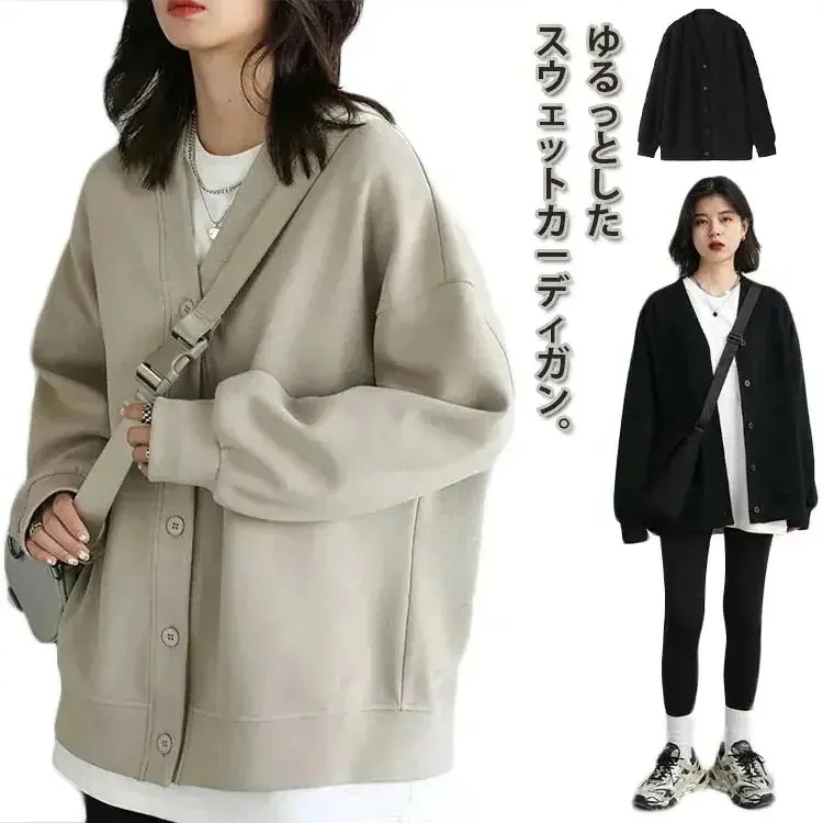 スウェットカーディガンレディーストレーナー長袖トップスパーカージャケットライトコートVネック薄羽織りビッグシルエット大人かわいい大きいサイズゆったり体型カバー着痩せボタン重ね着通学通勤服