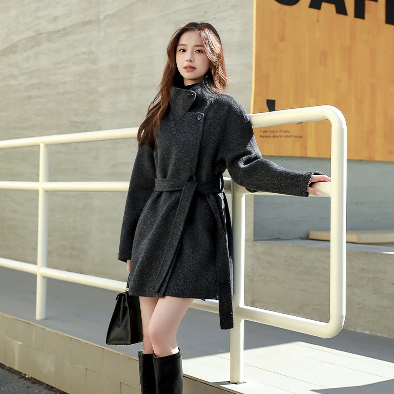 日韓スタンドカラーリバーシブルカシミヤコート女 2025年秋冬ファッション小柄でゆったりした毛のコート気質パーカー・ブレザーネックコート・毛のコート