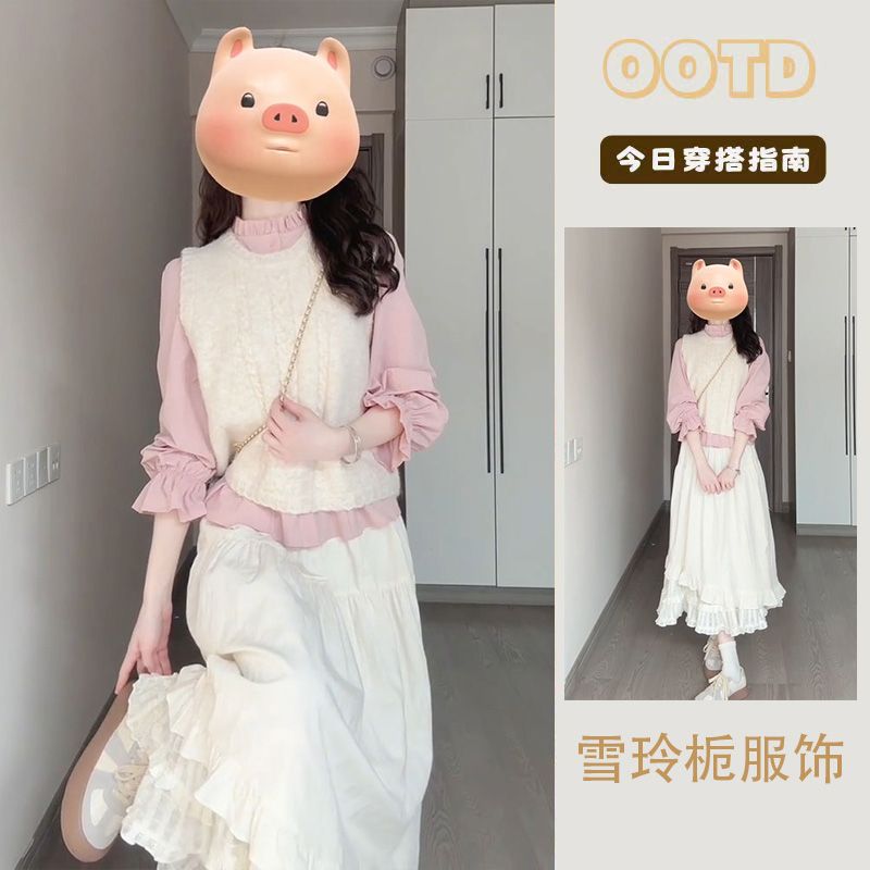 ソフトコーデ 3点セット ケーブルニットベスト+ピンクピコピコブラウス+ハイウエストスカート アカデミックスタイル セットアップ 新品掲載!レディース セットアップ セット セットアップ スウェット